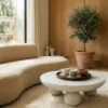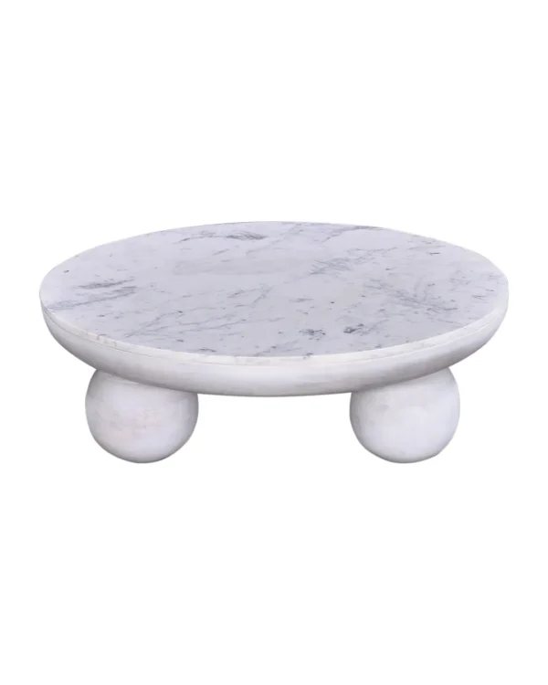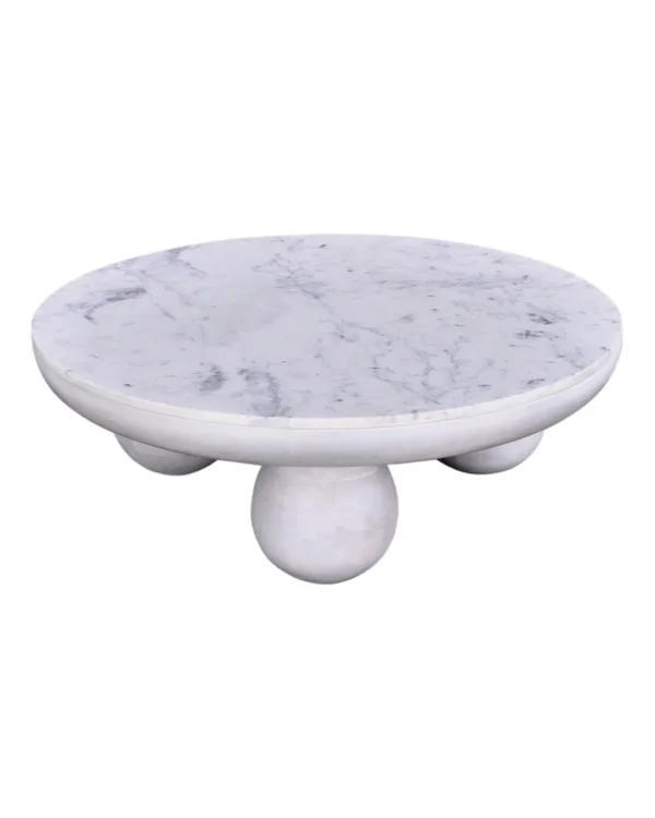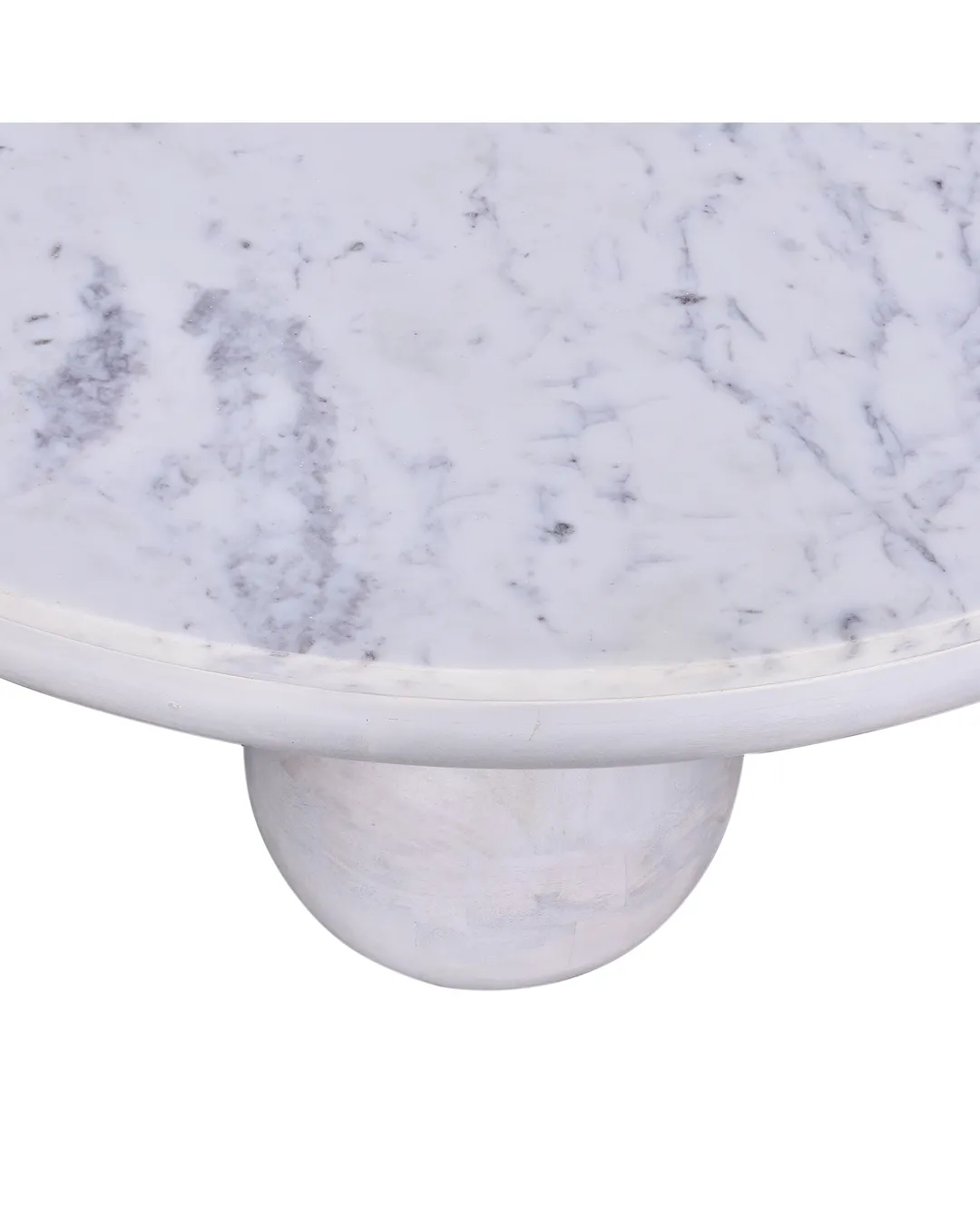 Design Profile: The design profile is defined by Soft Minimalism and Contemporary Biomorphism. By utilizing a monochromatic palette of Indian White marble for both the top and the spherical legs, the piece emphasizes pure form and natural texture over color contrast. The exaggerated proportions of the orb legs provide a sense of balanced weight and whimsical luxury. This table is an ideal anchor for bright, airy interiors—such as Scandia-Modern or high-end Minimalist spaces—where it serves as a tactile and sculptural centerpiece that celebrates the serene beauty of natural stone.