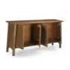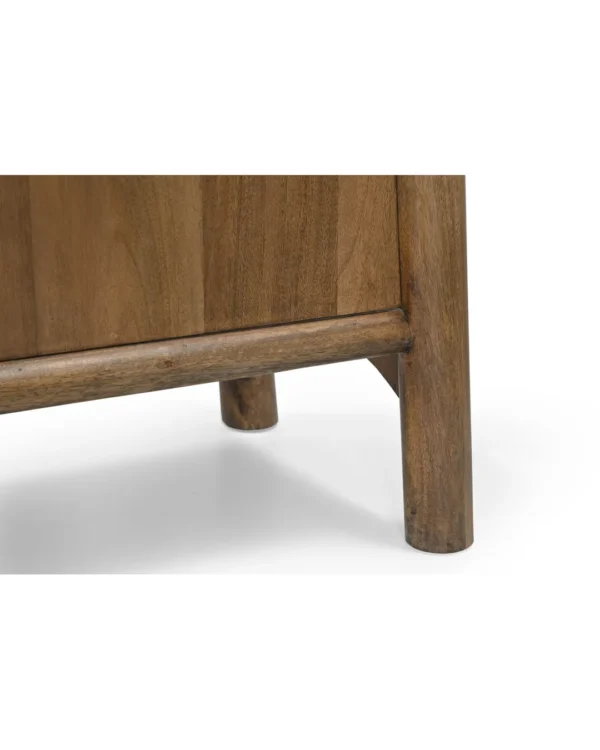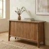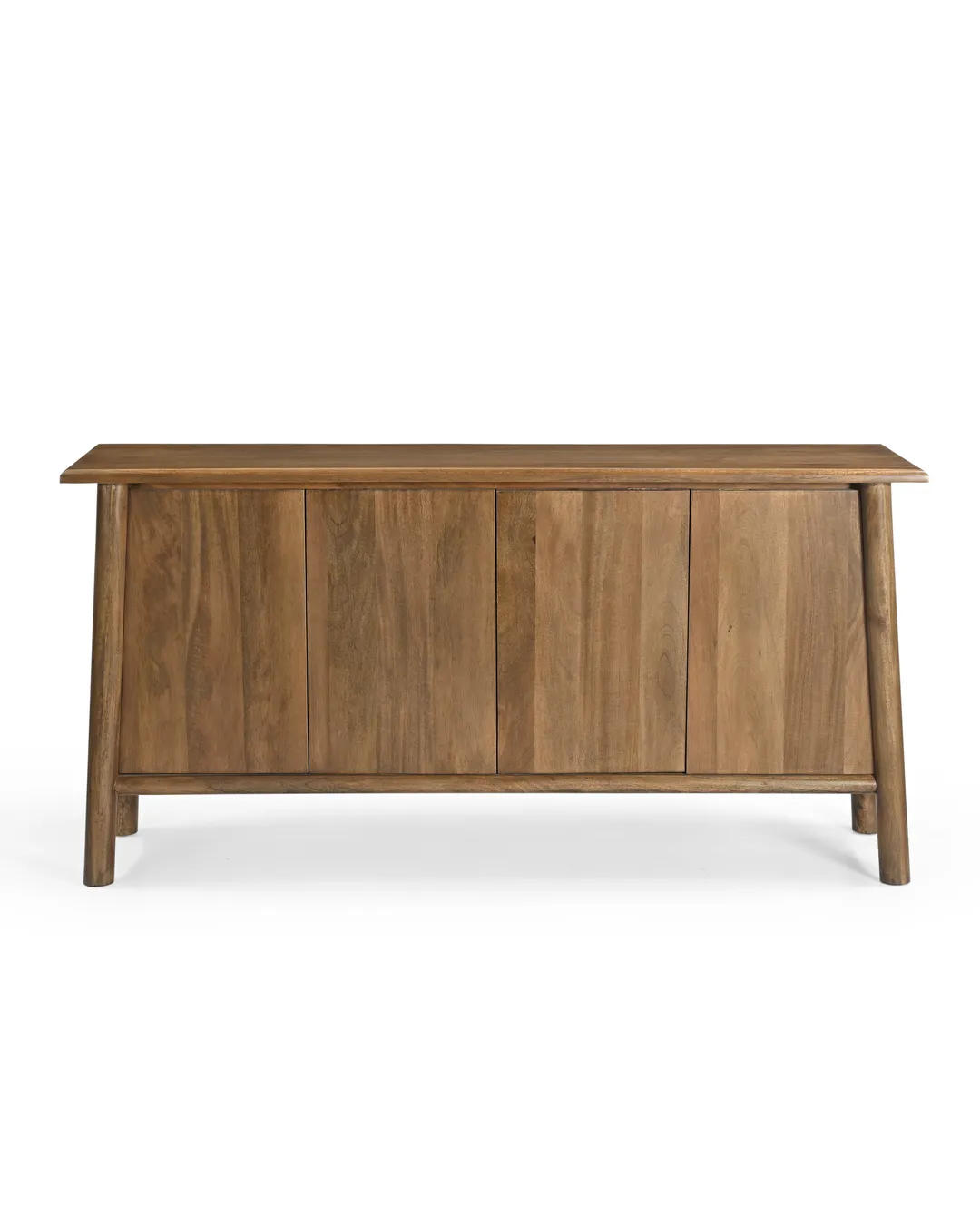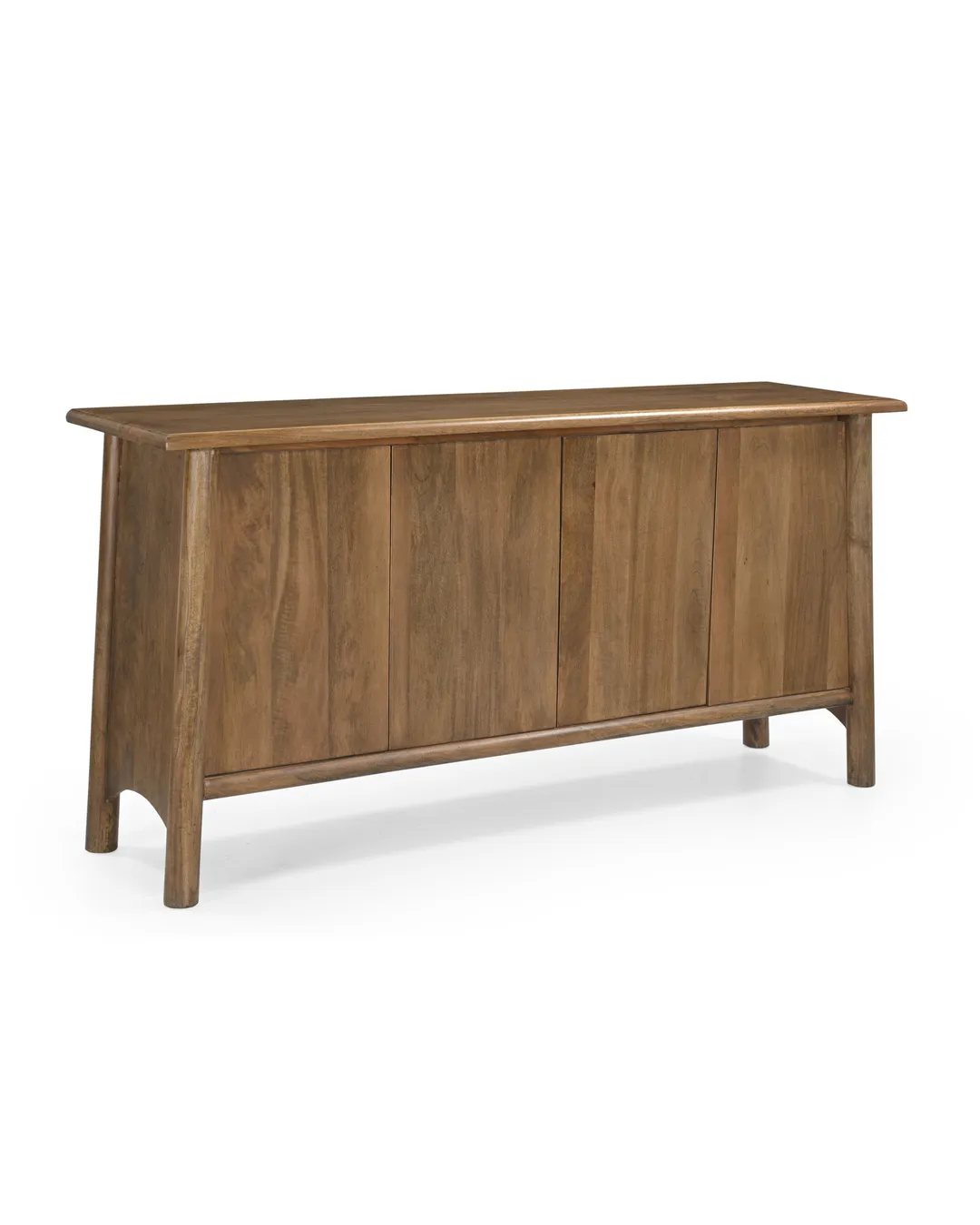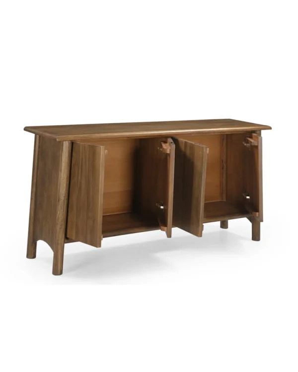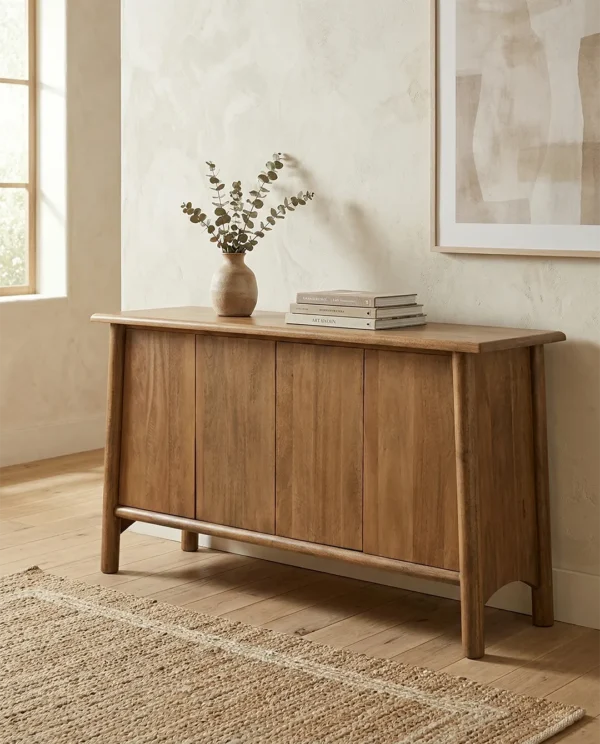 Design Profile: A masterclass in functional design, this four-door sideboard combines expansive storage with a streamlined, mid-century modern silhouette. The handle-less door design emphasizes the natural beauty of the wood grain, creating a seamless “hidden” look. Elevated by tapered legs with signature arched detailing, this piece provides ample surface area for decor or buffet-style serving while maintaining an airy, uncluttered footprint.