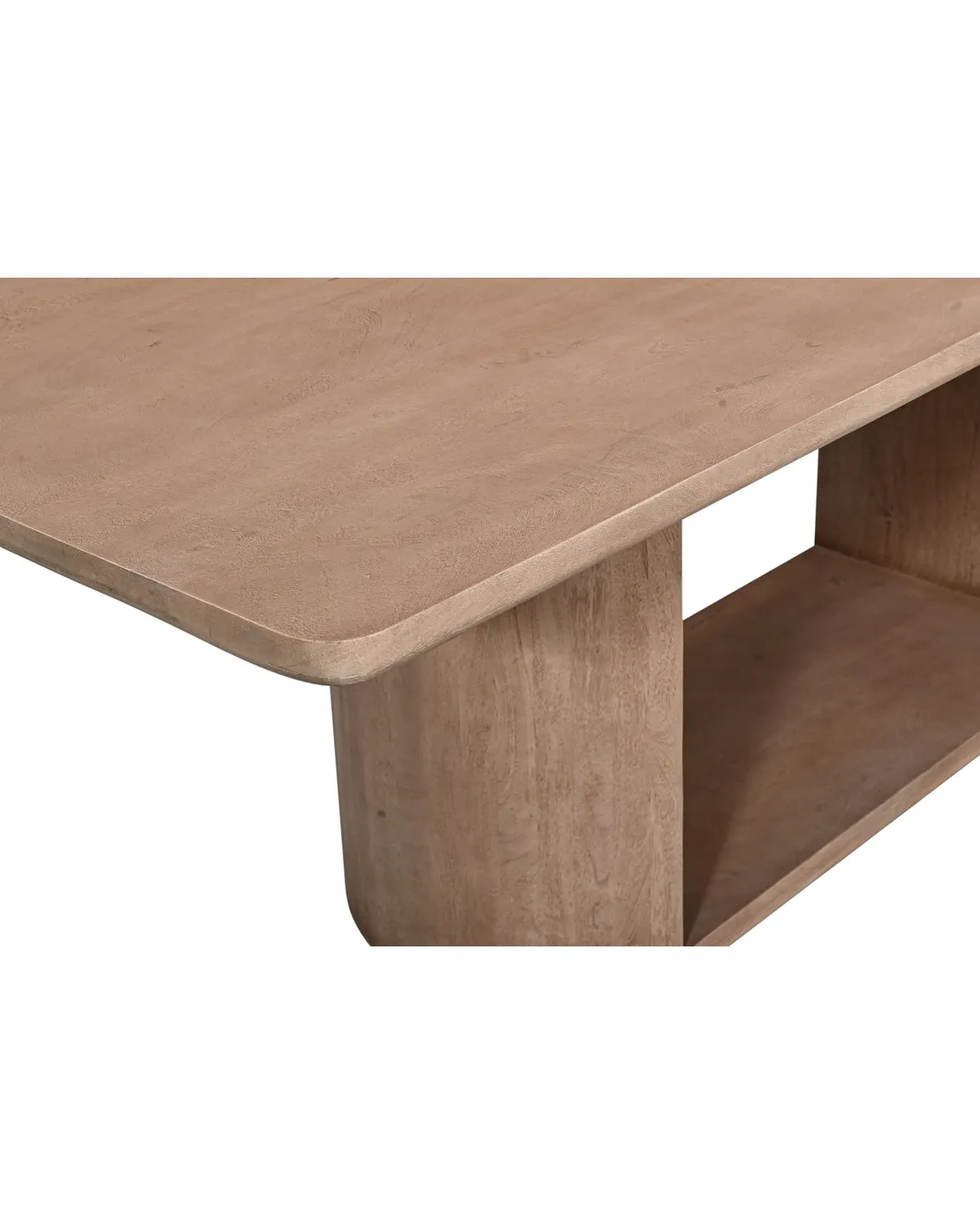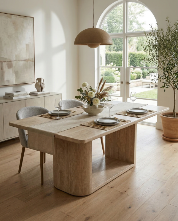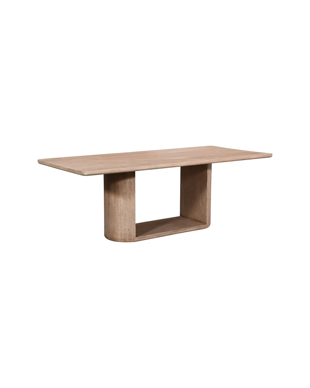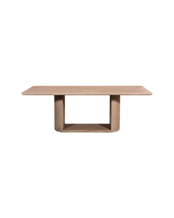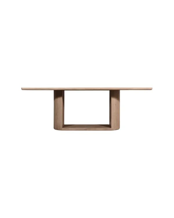 Design Profile: The design profile is defined by Architectural Minimalism and the “Quiet Luxury” of structural honesty. By utilizing a heavy, pedestal form and then “sculpting” it to reveal a void, the table achieves a balanced and unique aesthetic that bridges the gap between furniture and functional art. The hand-finished mango wood emphasizes tactile warmth, while the wide, rounded base ensures maximum stability and ample legroom for guests. This piece is an ideal fit for Japandi, Scandia-Modern, or high-end Coastal interiors that prioritize light-filled spaces and serene, monochromatic palettes.