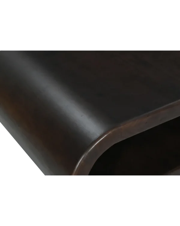 Design Profile: This coffee table features a retro-modern “capsule” silhouette, defined by its continuous, wraparound wooden frame and deeply rounded ends. The hollow-core design creates a sleek open-shelf storage area, while the subtle, integrated block feet provide a grounded yet floating appearance.