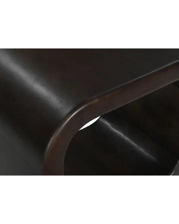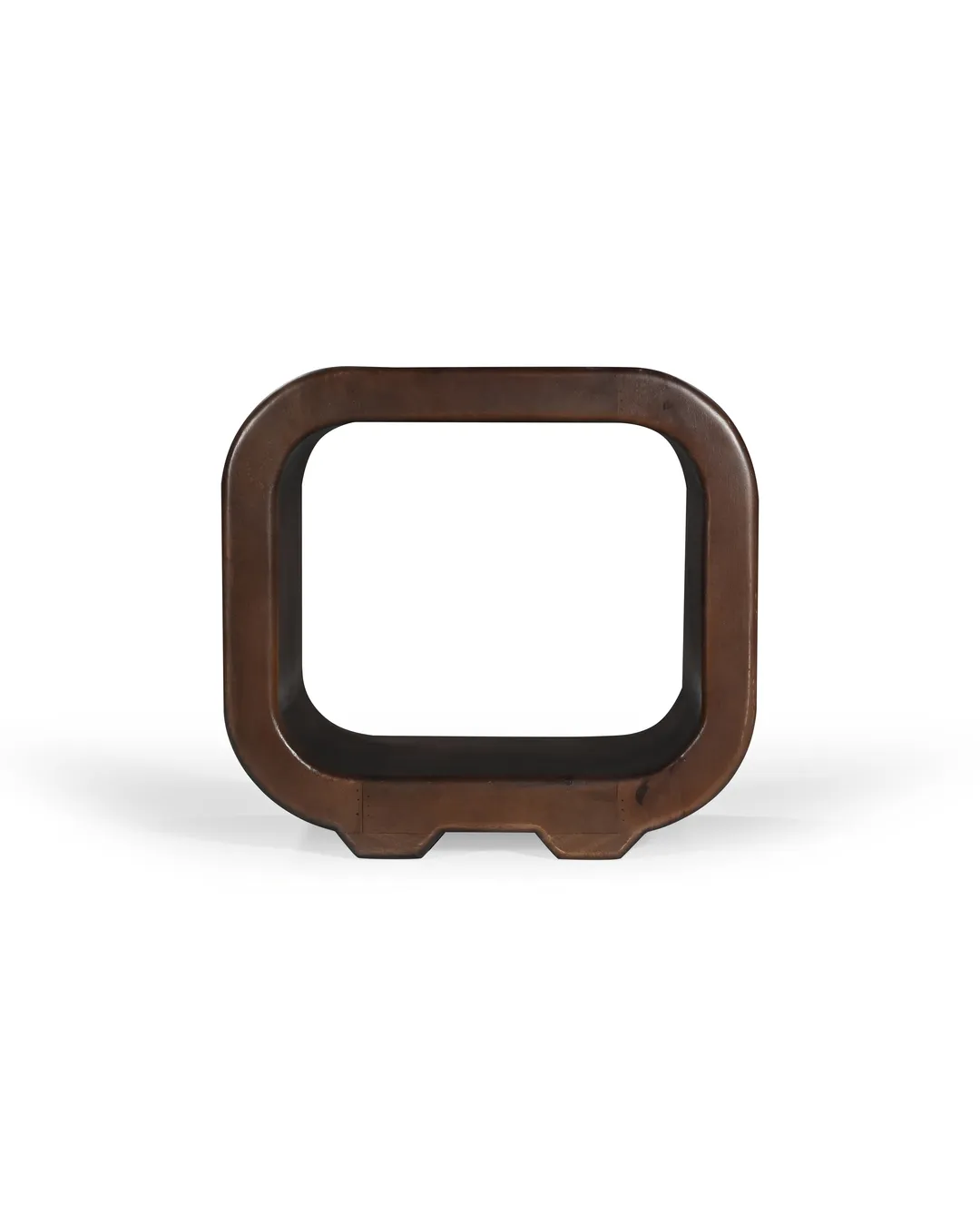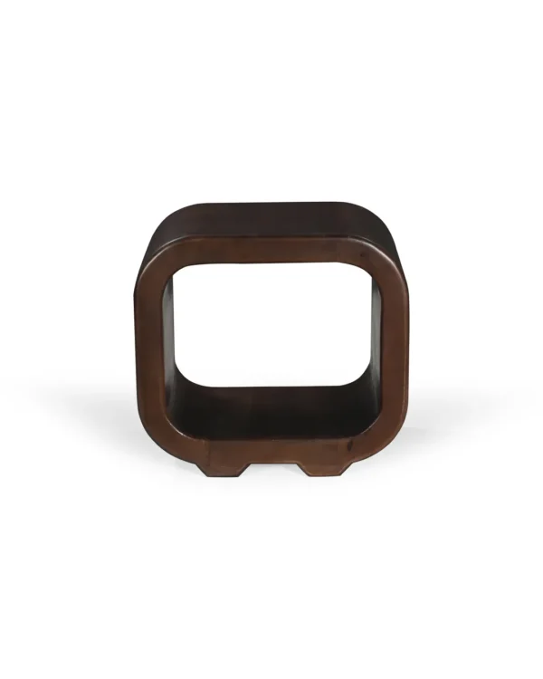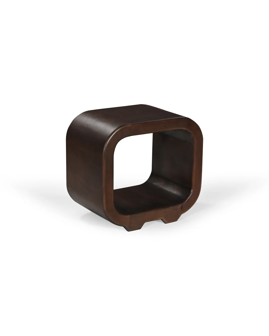Design Profile: This accent table features a modern “rounded cube” silhouette, defined by its continuous, hollow-core wooden frame and soft, radiused corners. The seamless architectural design serves as a sculptural frame for open storage, supported by integrated block feet that maintain its clean, geometric profile.