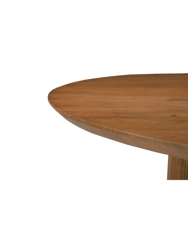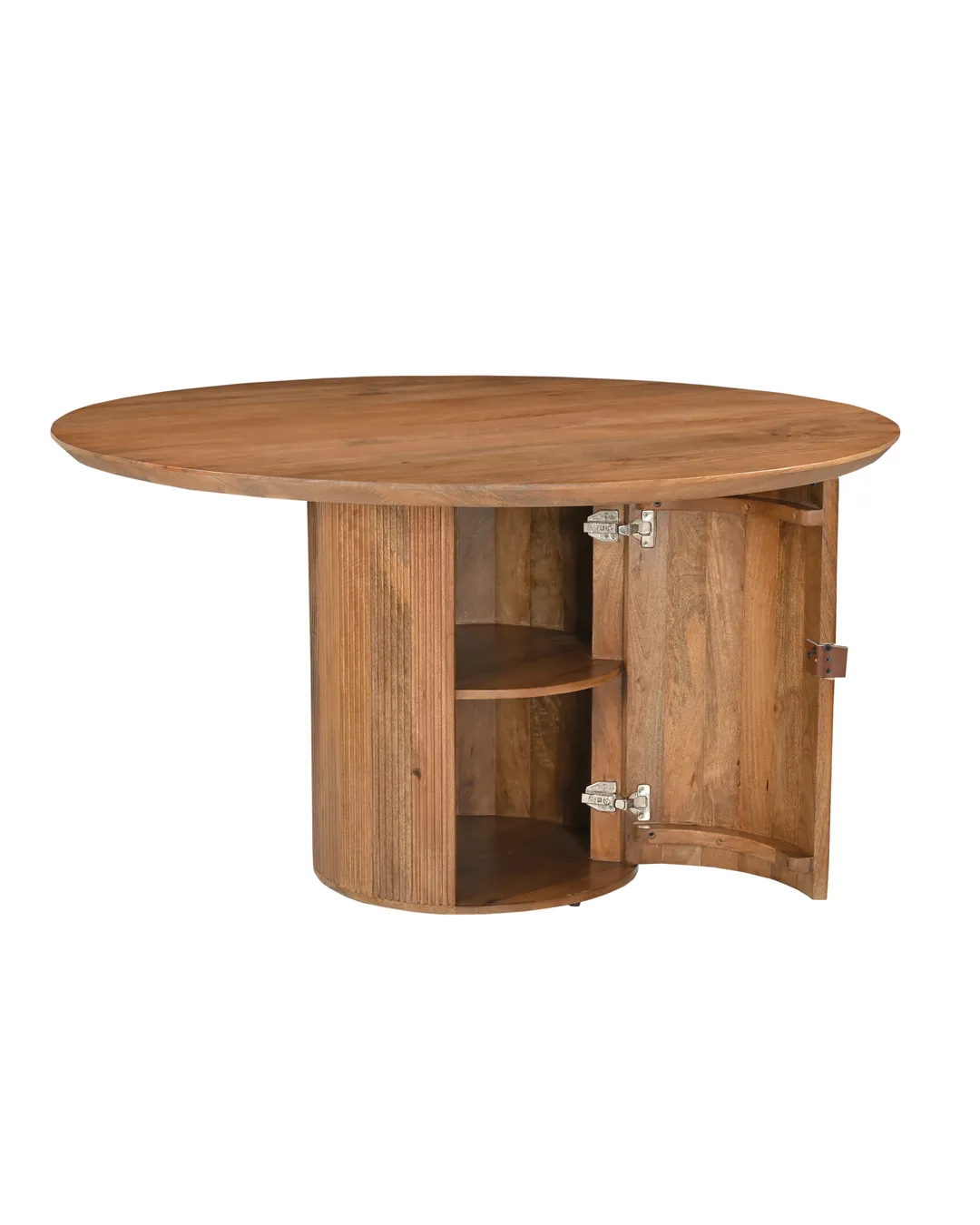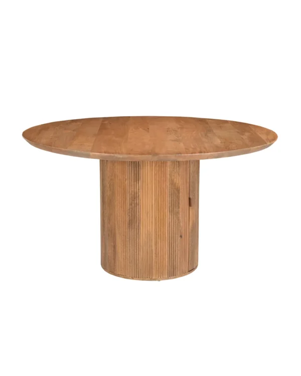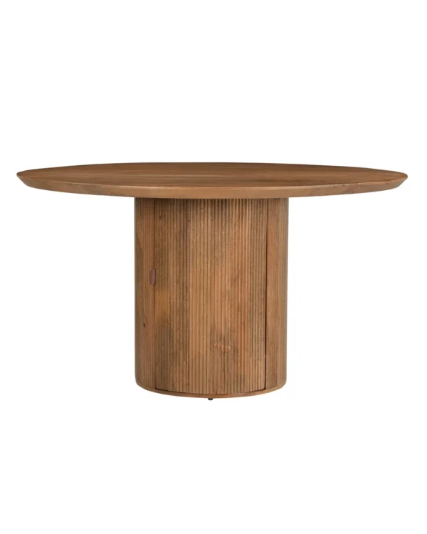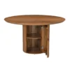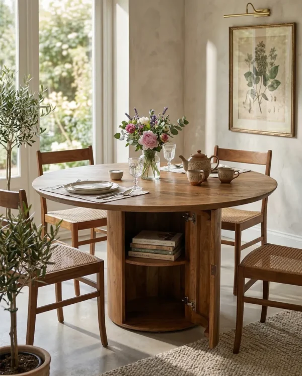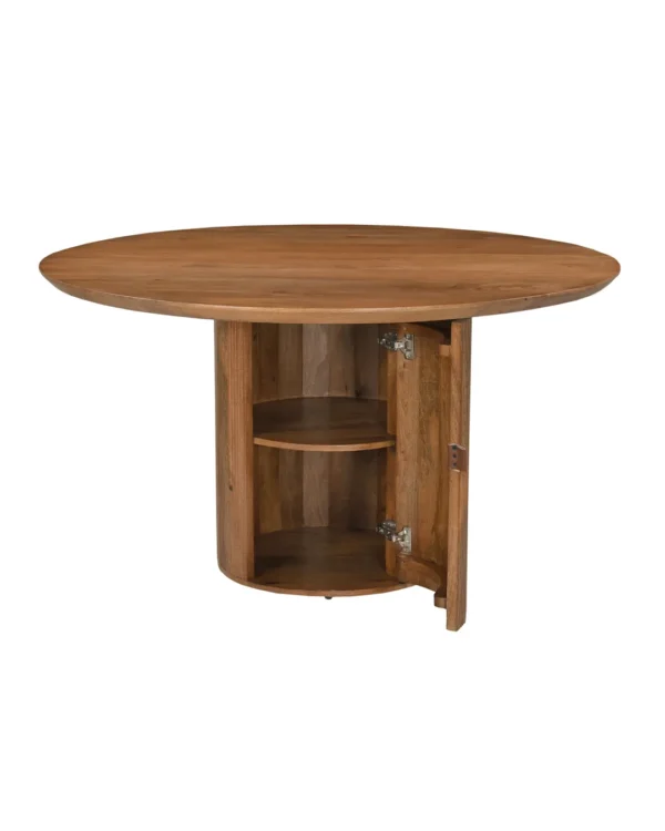 Design Profile: The design profile aligns with Smart Minimalism and Modern Craft, focusing on the “hidden luxury” of integrated storage. By utilizing a heavy, pedestal base to anchor a fluid, circular top, the piece achieves a balanced and architectural presence while maintaining a small footprint. The use of hand-finished mango wood emphasizes tactile warmth and artisanal quality. This dining table serves as a dual-purpose focal point, offering a clean, sculptural aesthetic that solves the common challenge of storage in urban homes. It is a definitive statement piece that bridges the gap between high-end furniture design and practical, everyday living.