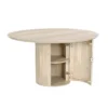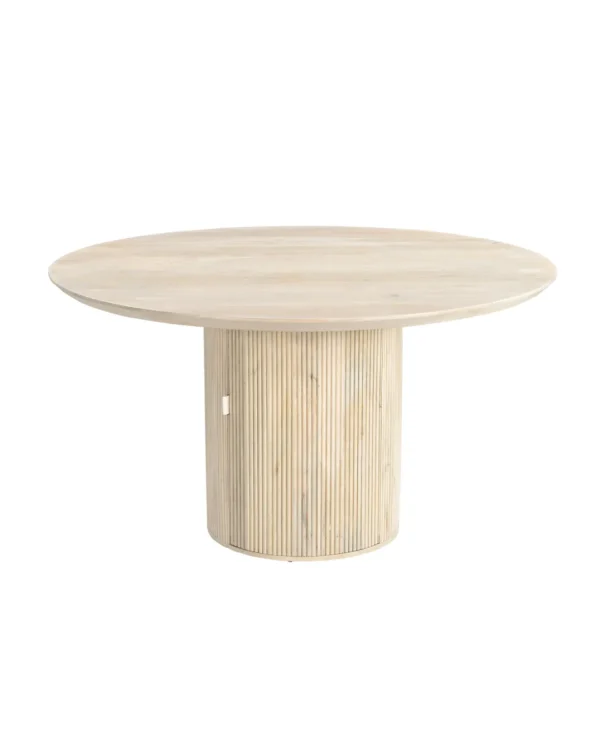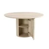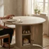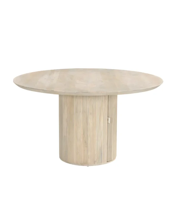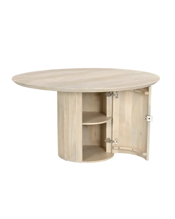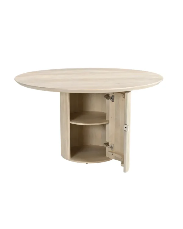 Design Profile: The design profile aligns with Smart Minimalism and Modern Craft, focusing on the “hidden luxury” of integrated storage. By utilizing a heavy, pedestal base to anchor a fluid, circular top, the piece achieves a balanced and architectural presence while maintaining a small footprint. The use of hand-finished mango wood emphasizes tactile warmth and artisanal quality. This dining table serves as a dual-purpose focal point, offering a clean, sculptural aesthetic that solves the common challenge of storage in urban homes. It is a definitive statement piece that bridges the gap between high-end furniture design and practical, everyday living.