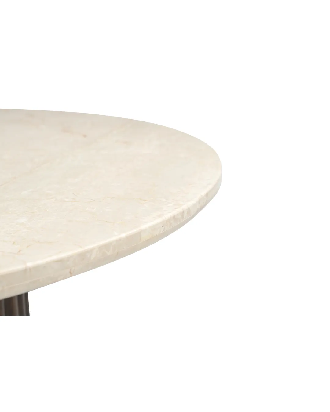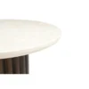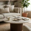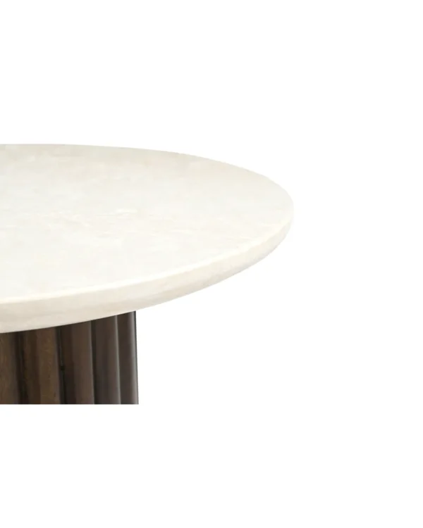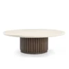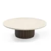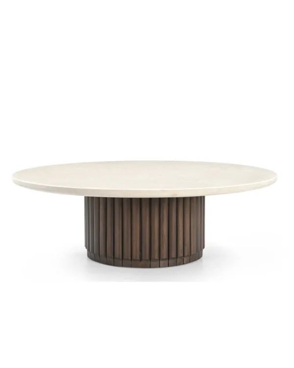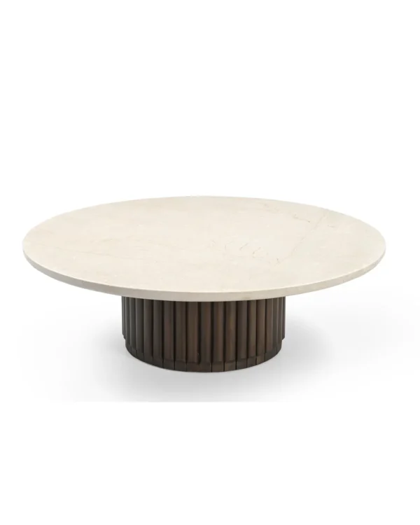 Design Profile: This coffee table features a low-profile, circular Italian Botticino marble top with a refined bullnose edge. Its monolithic, drum-style base is wrapped in deep vertical fluting and finished in a rich dark wood, creating a bold, grounded centerpiece with a high-contrast architectural silhouette.