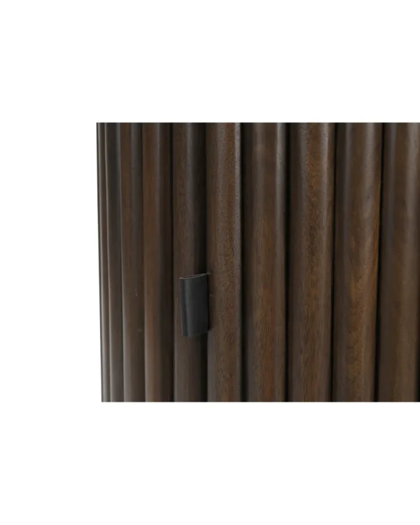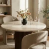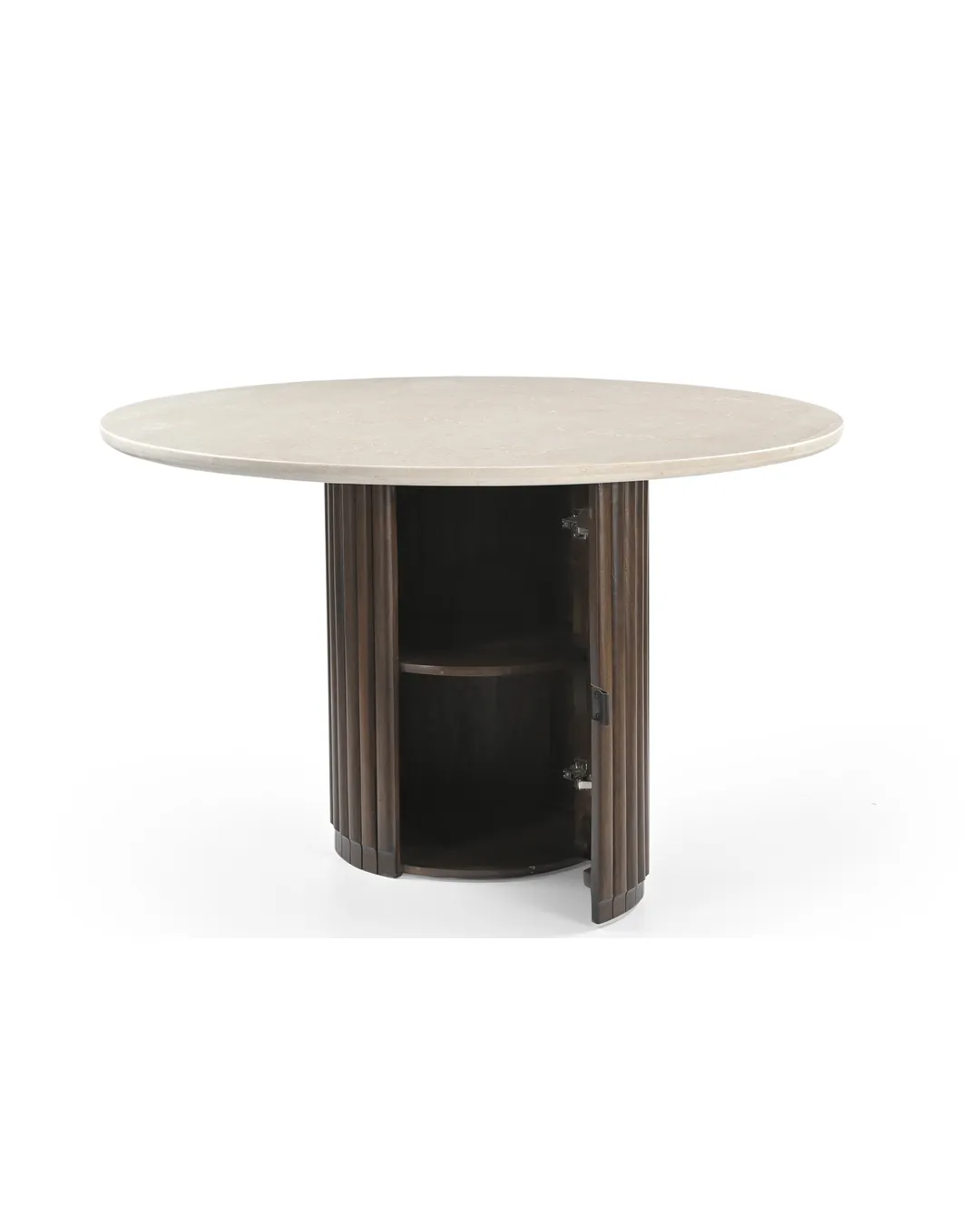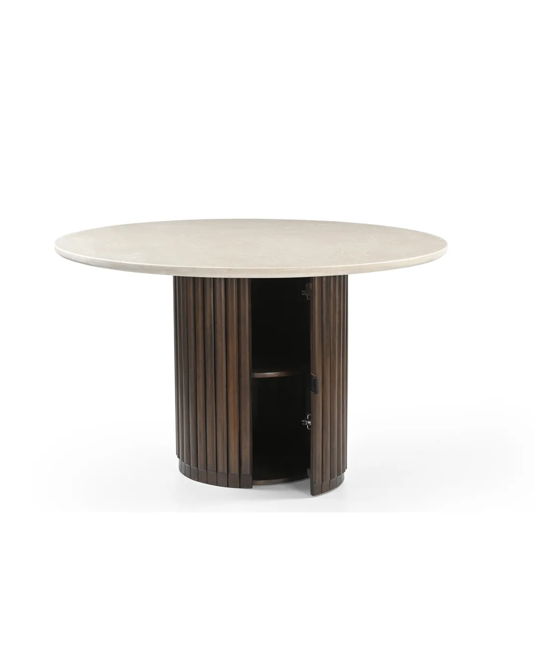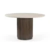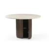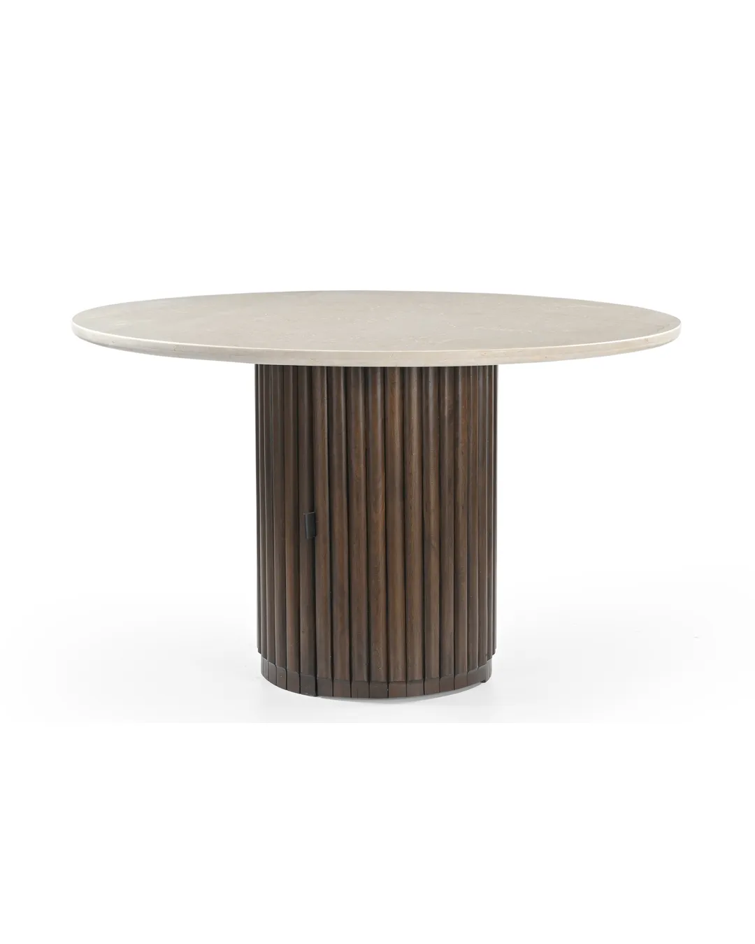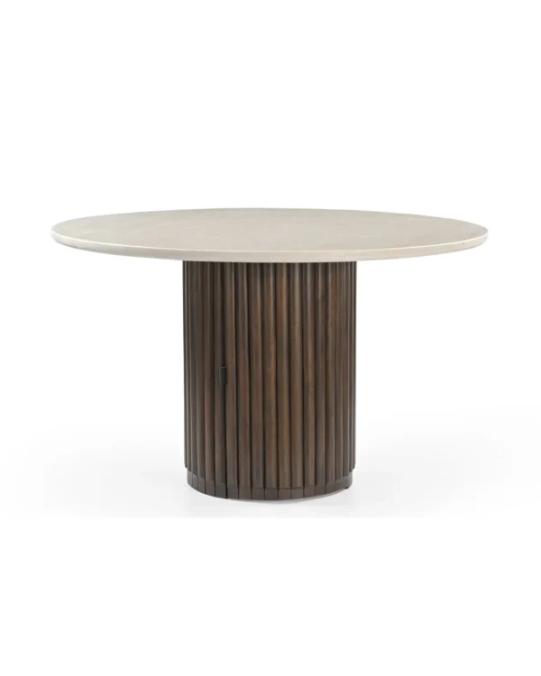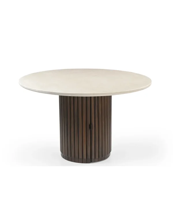 Design Profile: This dining table features a sleek, circular Italian Botticino marble top paired with a bold, monolithic pedestal base. The drum-style support is wrapped in deep vertical fluting and finished in a rich dark wood, creating a striking architectural focal point with a high-contrast aesthetic.