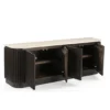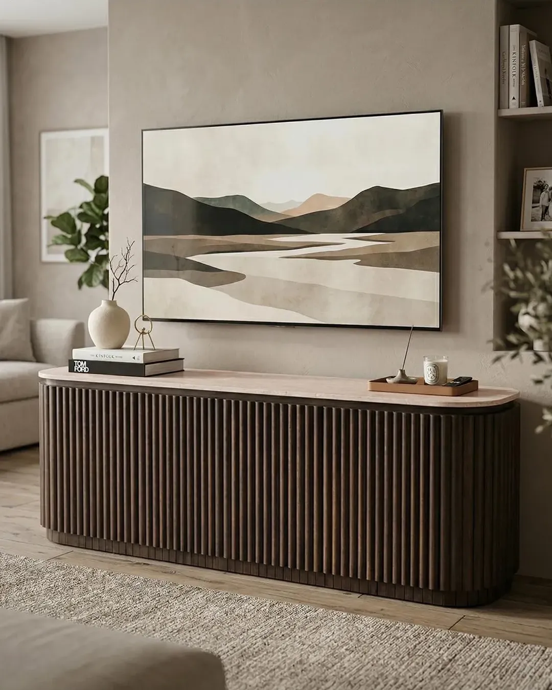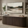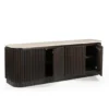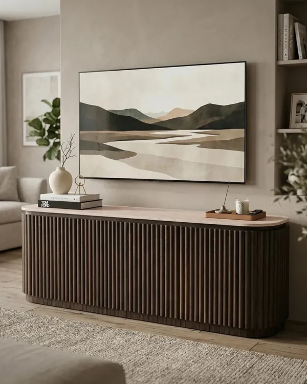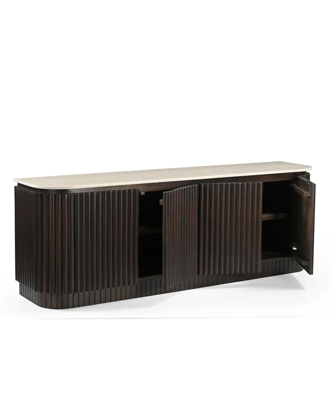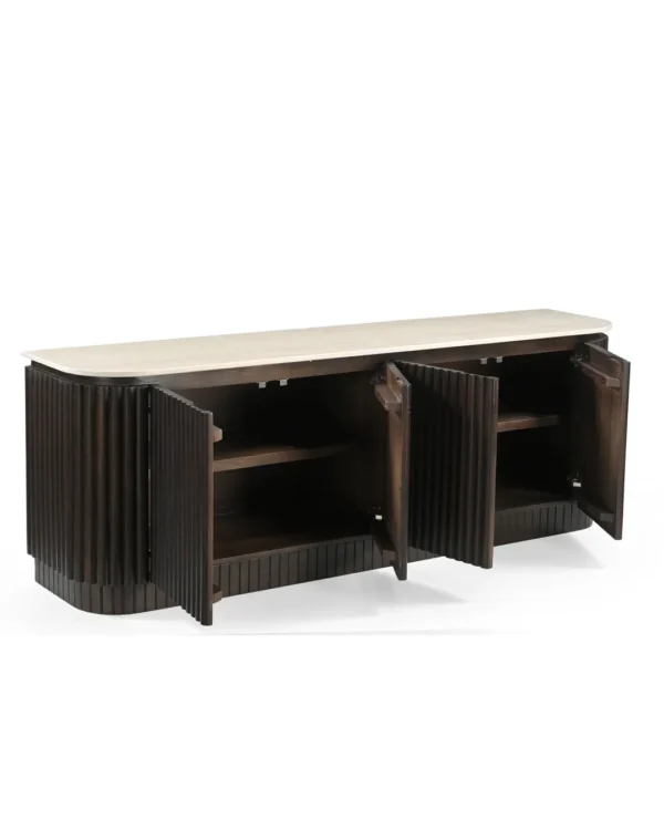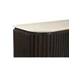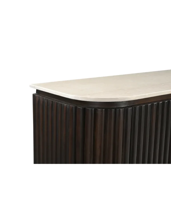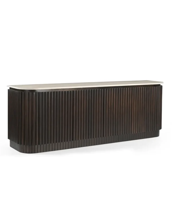 Design Profile: This elegant side board features a slender Italian Botticino marble top with soft, radiused edges resting upon a monolithic, tambour-style base. The curved silhouette is wrapped in deep vertical fluting, finished in a dark walnut tone that emphasizes its rhythmic texture and architectural presence.