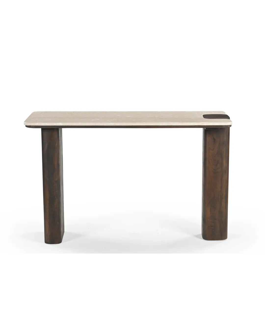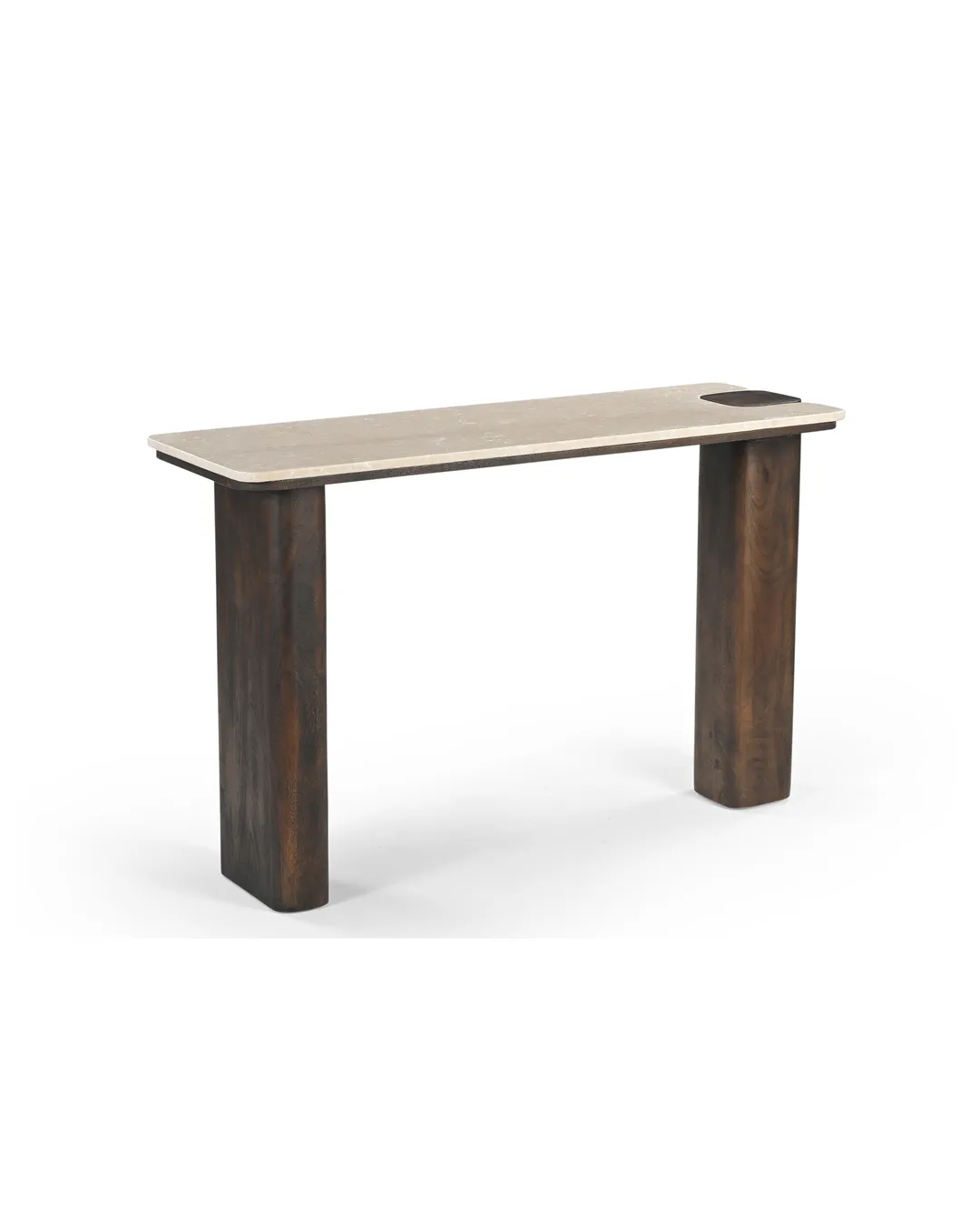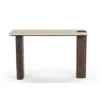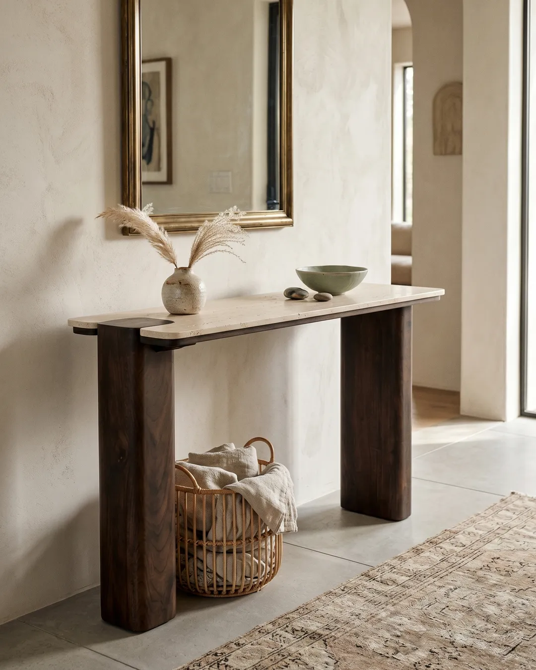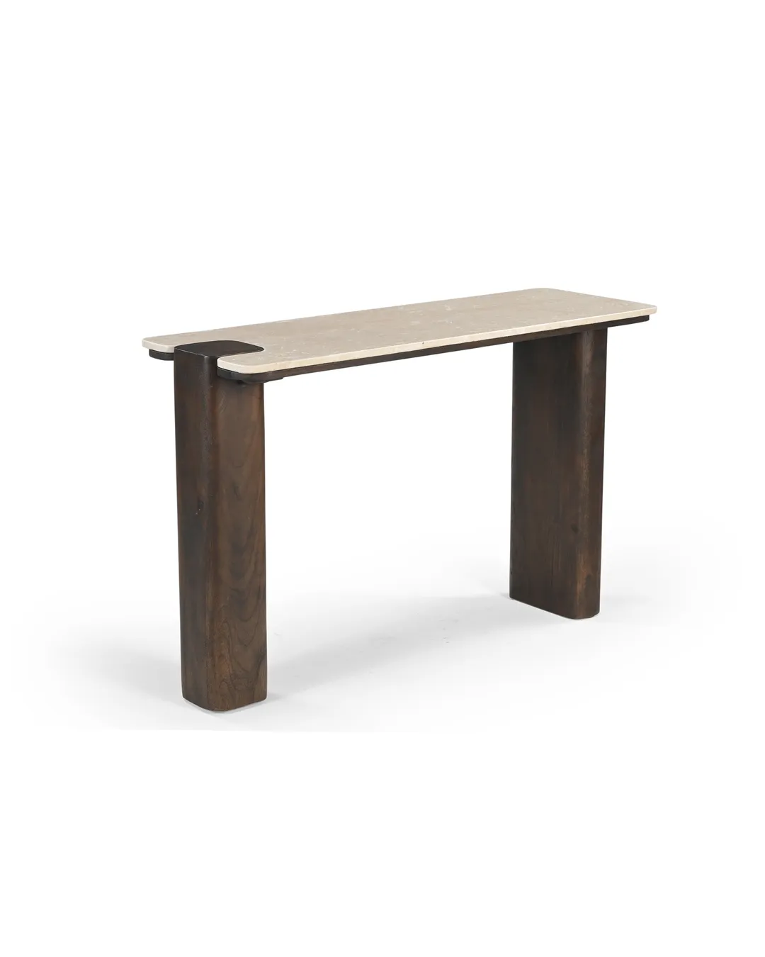 Design Profile: The design profile is defined by Architectural Minimalism and Interlocking Forms. By utilizing the “puzzle-fit” joinery where the marble meets the timber, the piece achieves a sense of custom, artisanal luxury. The contrast between the smooth, polished Botticino surface and the dark, textured wooden pillars emphasizes the raw beauty of both materials. This console is a perfect fit for “Quiet Luxury” interiors that prioritize structural honesty and a serene, monochromatic palette, serving as a functional work of art that feels both ancient and contemporary.