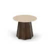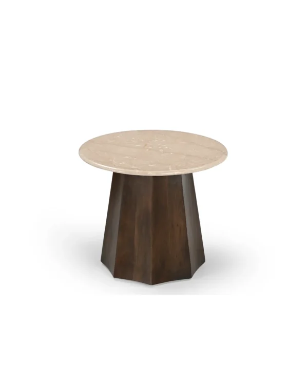 Design Profile: The table is anchored by a monumental, faceted pedestal base. Crafted from solid wood with a deep, charred-walnut finish, the base is shaped into a tapered heptagonal (seven-sided) column. This “Modern Brutalist” silhouette creates a dramatic interplay of light and shadow along its angular faces, providing a heavy, grounded foundation that beautifully offsets the light elegance of the marble top.