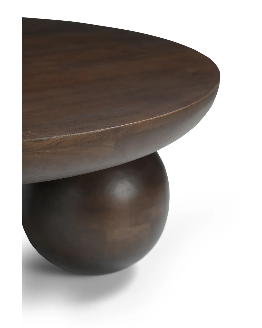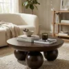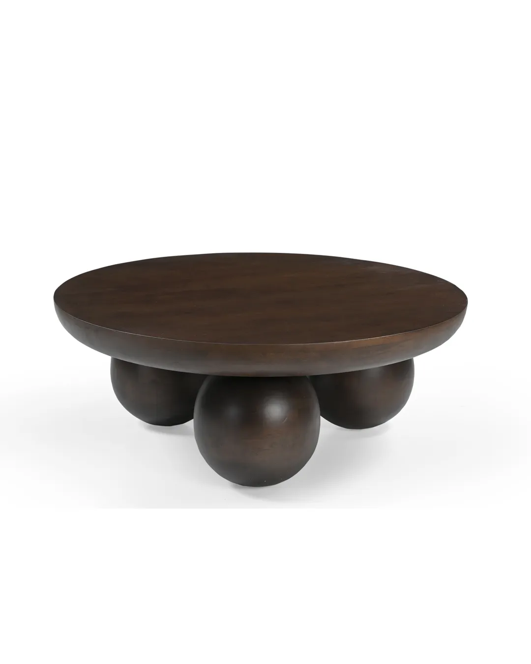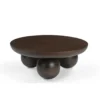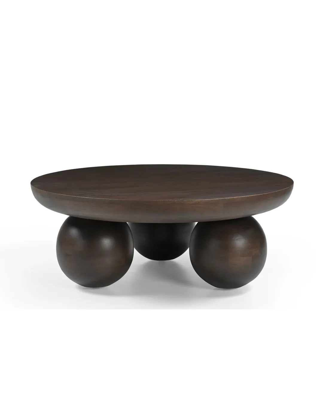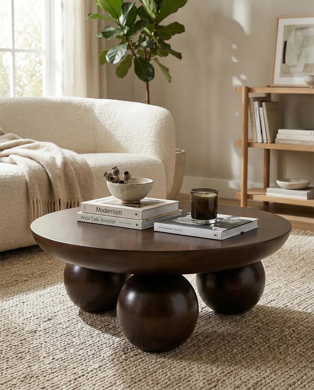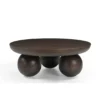 Design Profile: This low-profile coffee table features a deep, tray-style circular top with an elegant raised edge. Its signature look comes from three oversized, hand-carved spherical legs that provide a playful yet grounded “totemic” aesthetic in a rich, dark espresso finish.