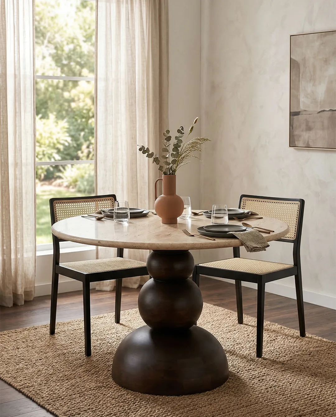 Design Profile: This dining table features a stunning contrast between a circular travertine stone top and a sculptural, stacked wooden pedestal base. The base is composed of tiered, hand-carved spherical forms that create a bold, totemic silhouette with a deep espresso finish.