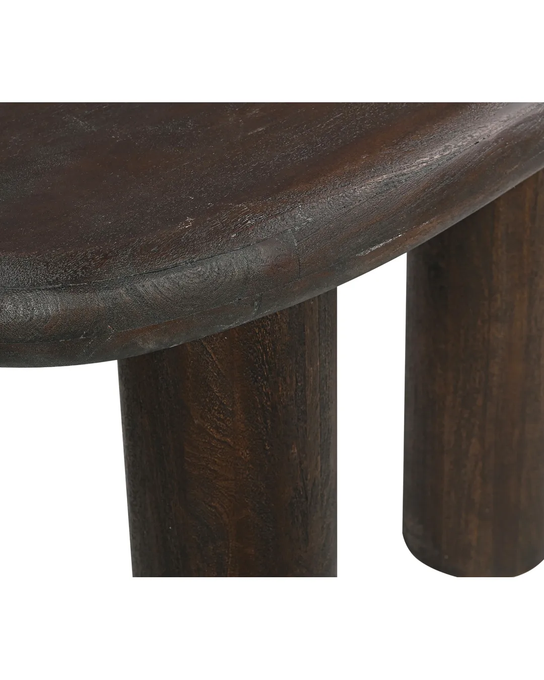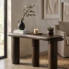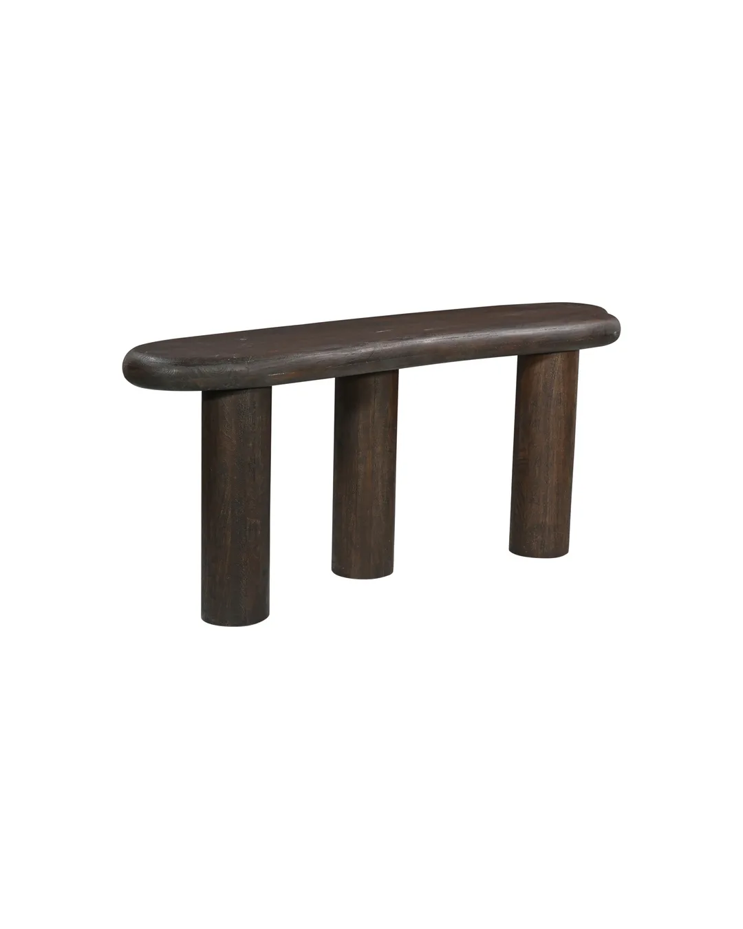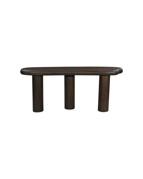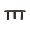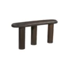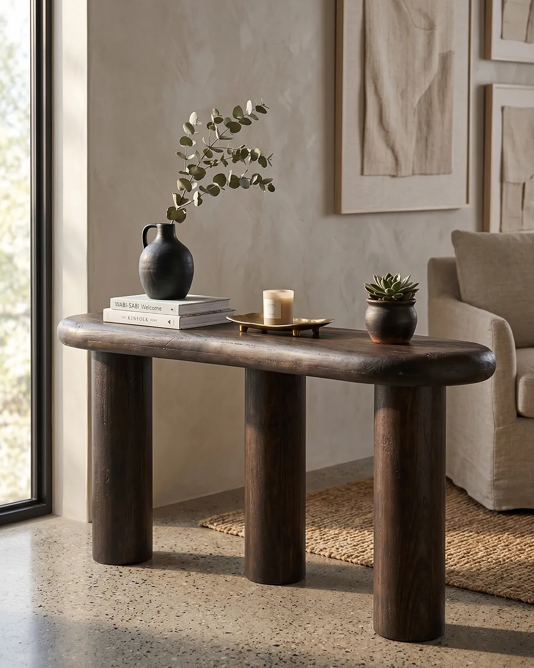 Design Profile: TThis console table features a bold, primitive-modern silhouette defined by a thick, pill-shaped (stadium) top with heavily rounded “bullnose” edges. It is supported by three substantial, cylindrical monolithic legs that provide a grounded, architectural rhythm and a sturdy, sculptural presence.