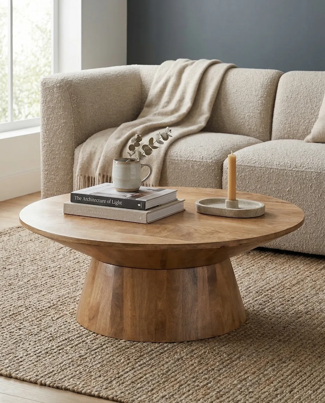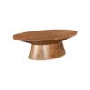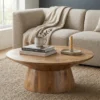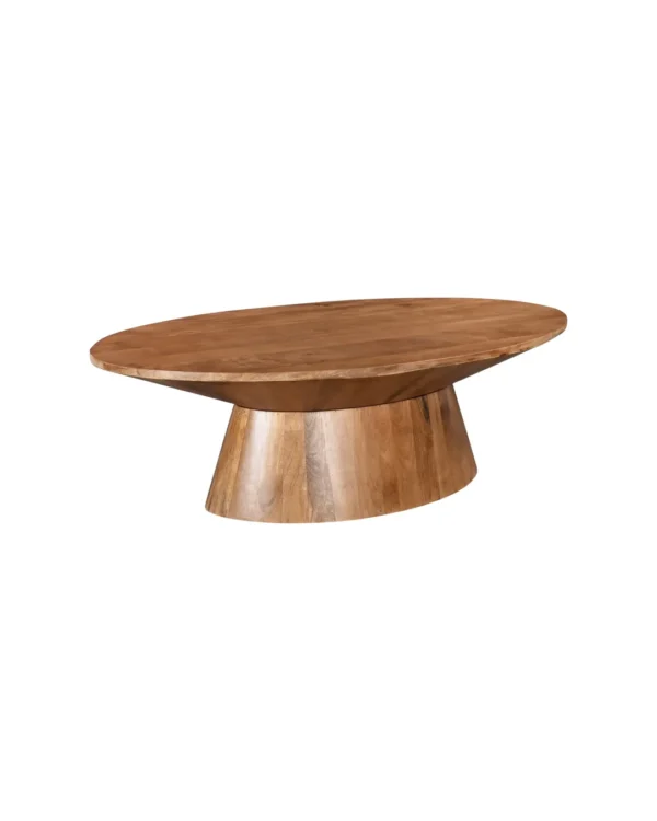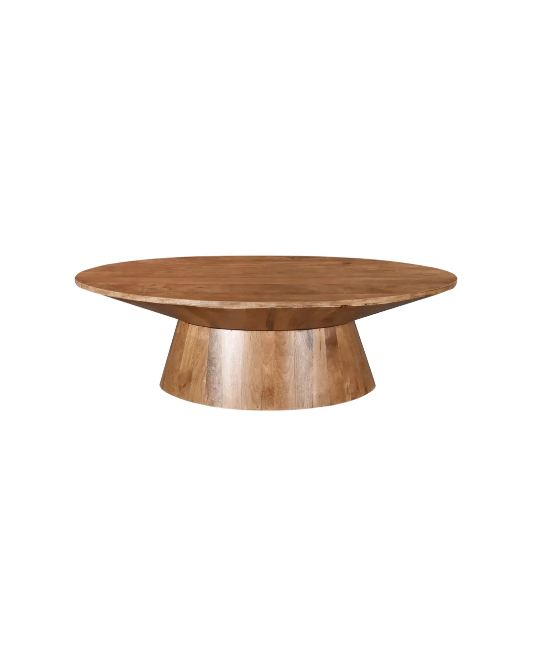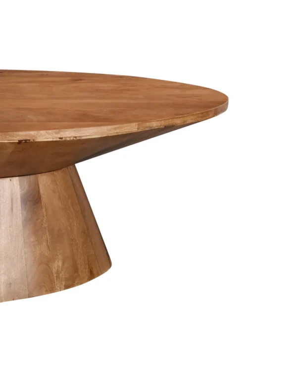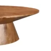 Design Profile: This coffee table features a striking, low-profile silhouette defined by a wide circular top that tapers elegantly inward to meet a truncated conical base. The seamless, monolithic design emphasizes bold geometric symmetry and showcases a rich, continuous wood grain throughout its sculptural form.