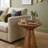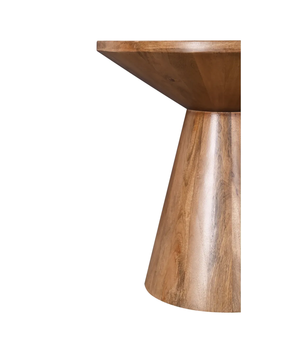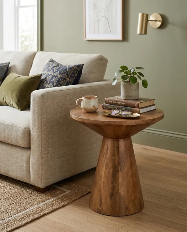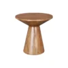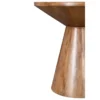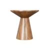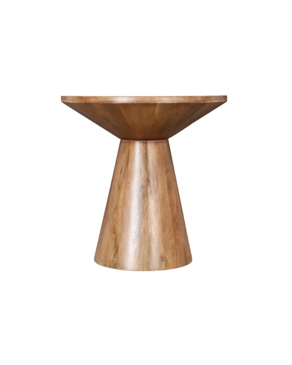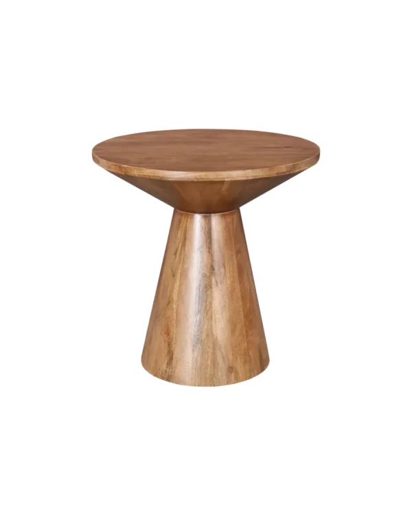 Design Profile: This accent table features a sculptural, hourglass-inspired silhouette defined by a circular top that tapers into a solid, truncated conical base. The seamless, monolithic design highlights the fluid continuity of the wood grain, creating a balanced and architectural geometric form.