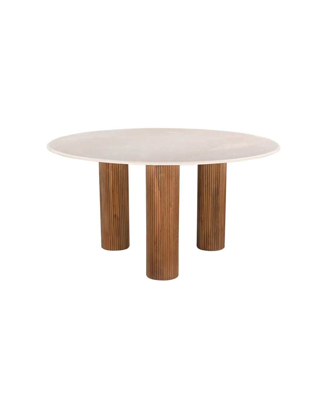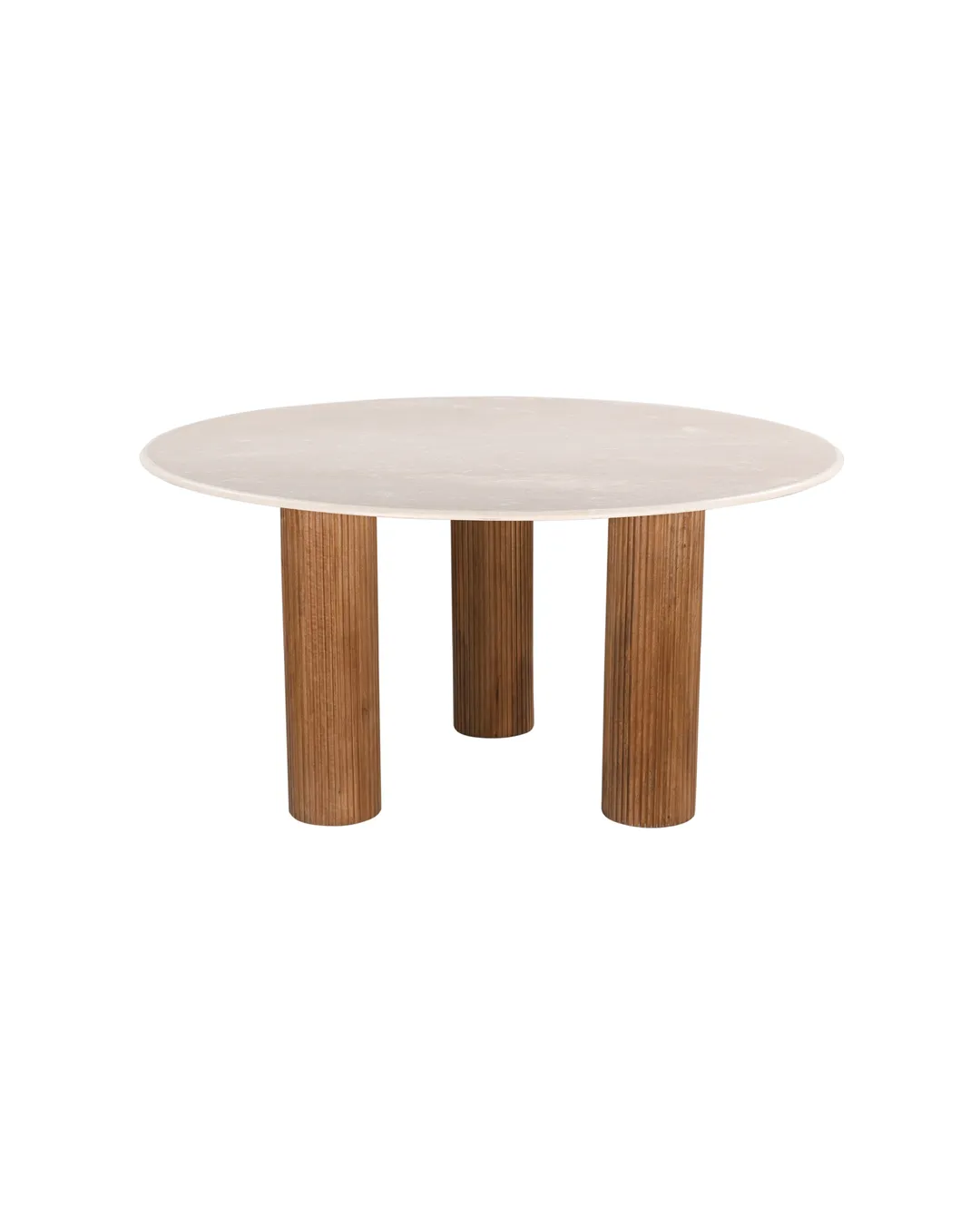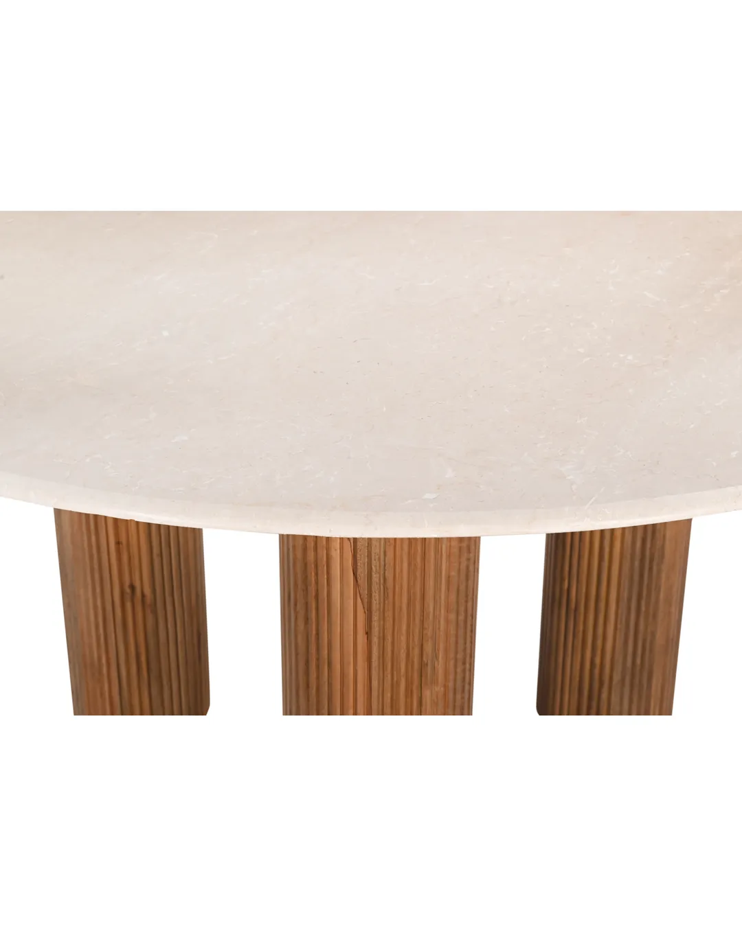 Design Profile: The design profile aligns with Modern Brutalism and New Classical aesthetics, focusing on the juxtaposition of smooth stone and highly textured timber. By utilizing exaggerated proportions—specifically the thick, fluted pillar-style legs—the table achieves a sense of architectural authority. The choice of Botticino marble adds a layer of refined opulence, while the artisanal mango wood base provides tactile warmth. This dining table is a functional work of art, ideal for interiors that value authentic materials, rhythmic patterns, and a serene, high-end palette.