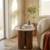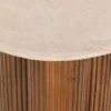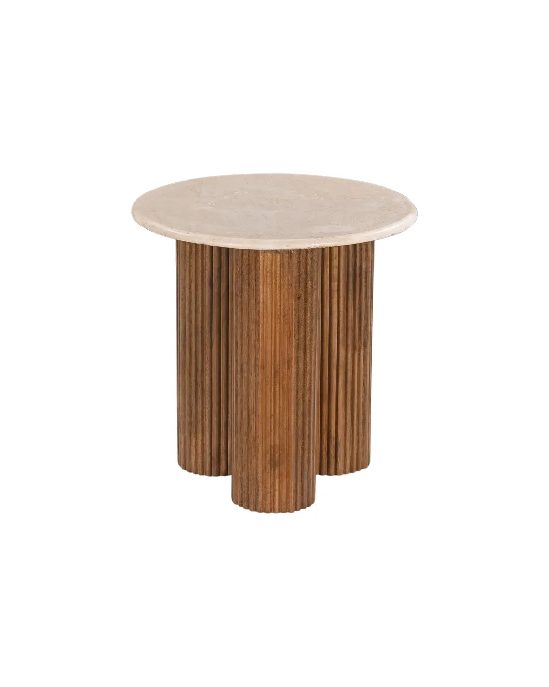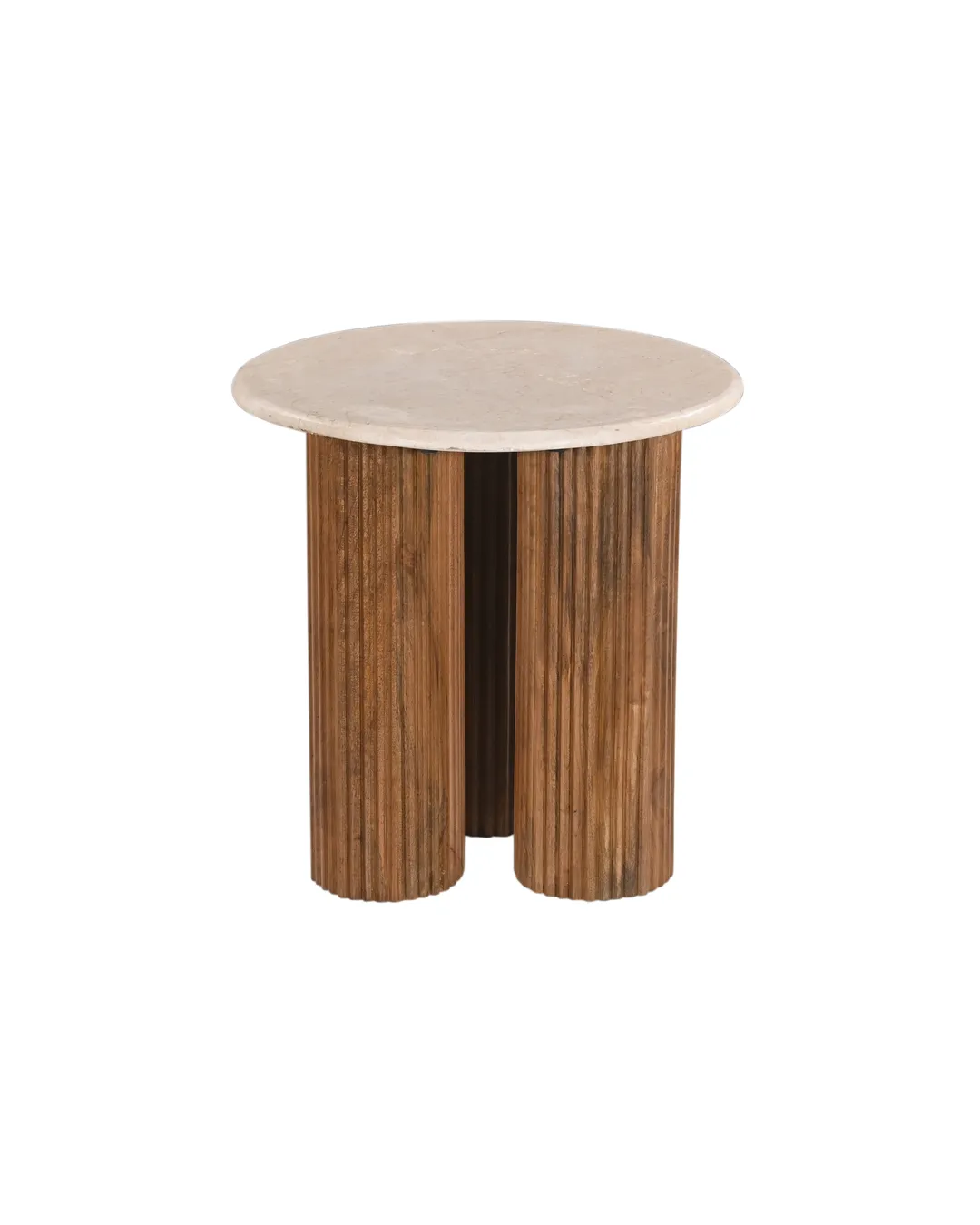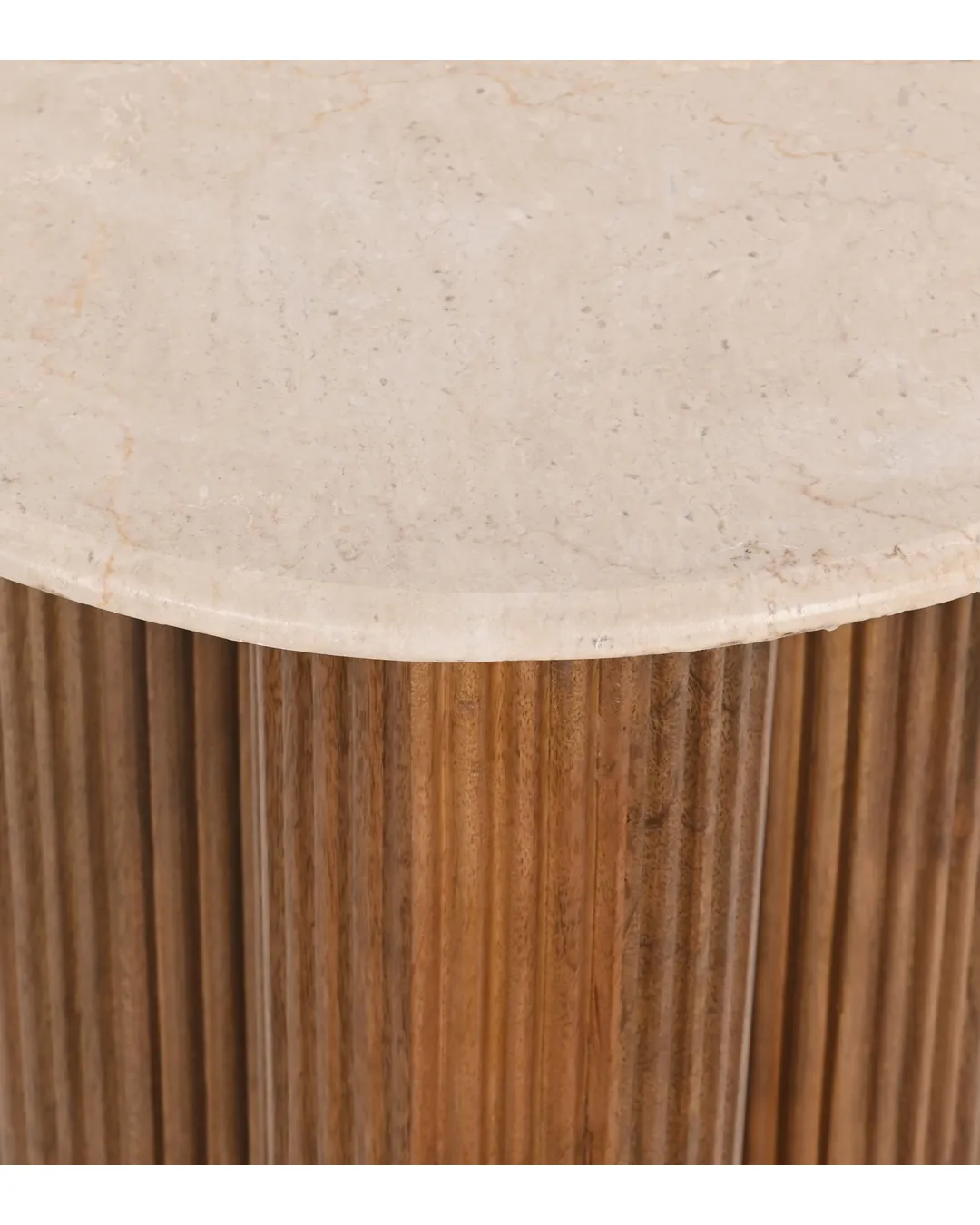 Design Profile: The design profile aligns with Modern Brutalism and New Classical aesthetics, focusing on the juxtaposition of smooth stone and highly textured timber. By utilizing exaggerated proportions—specifically the thick, fluted pillar-style legs—the table achieves a sense of architectural permanence. The choice of Italian Botticino marble adds a layer of refined opulence, while the artisanal mango wood base provides tactile warmth. This side table is a functional work of art, ideal for interiors that value authentic materials, rhythmic patterns, and a serene, high-end palette.