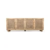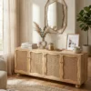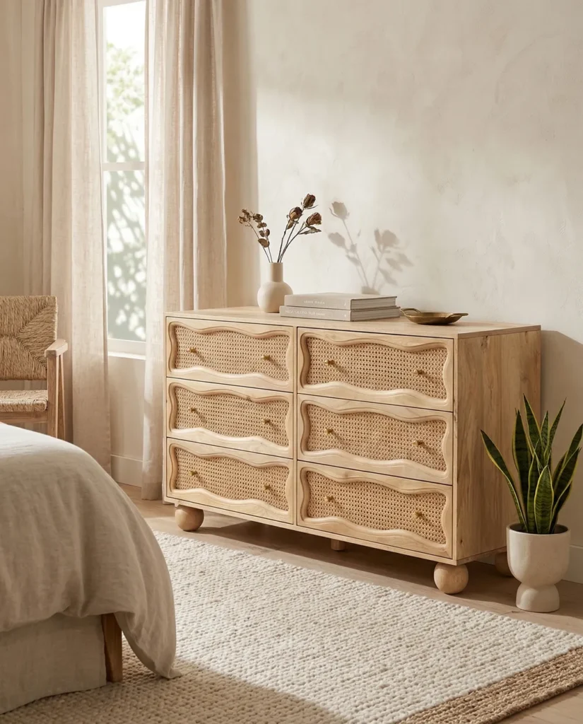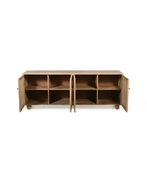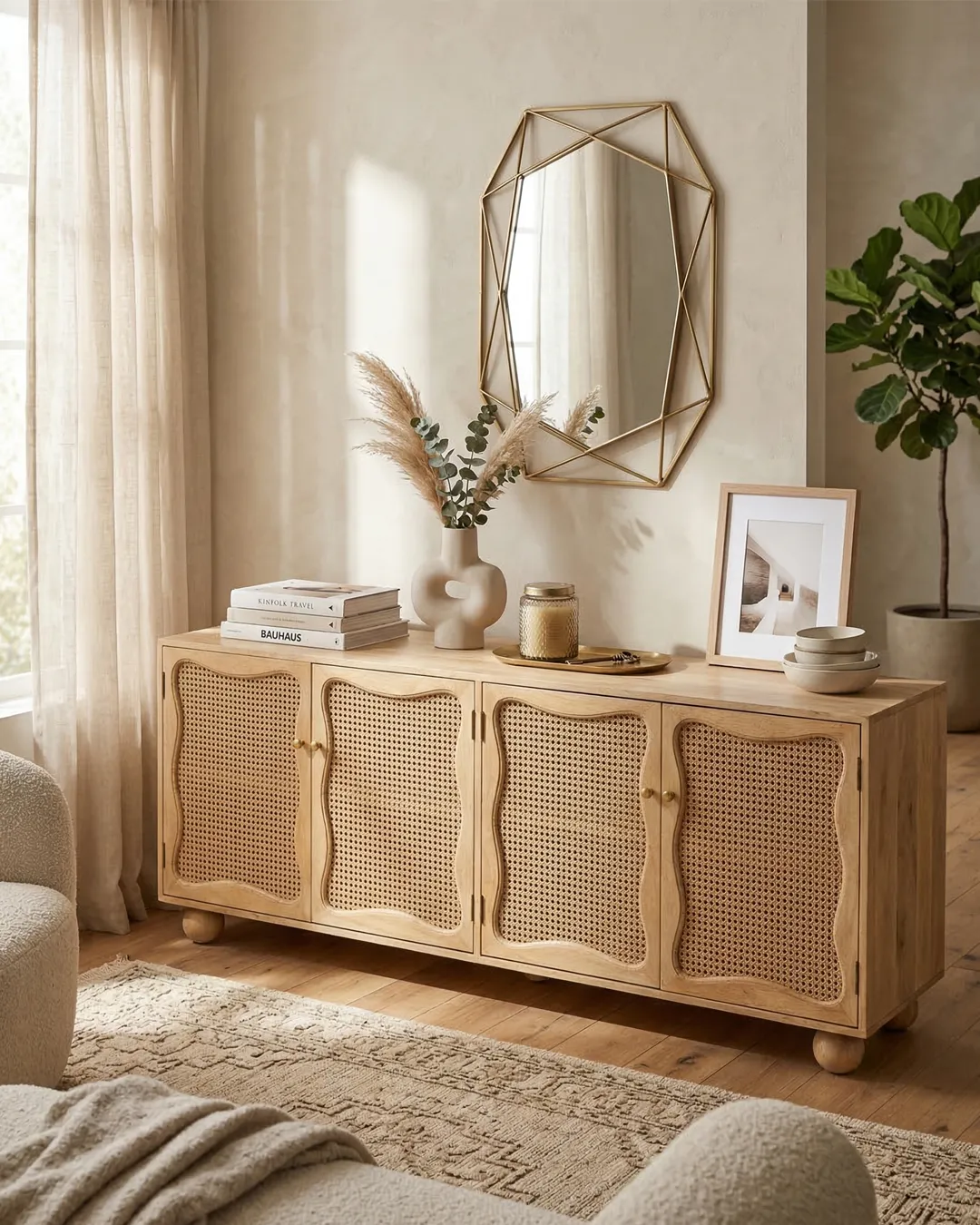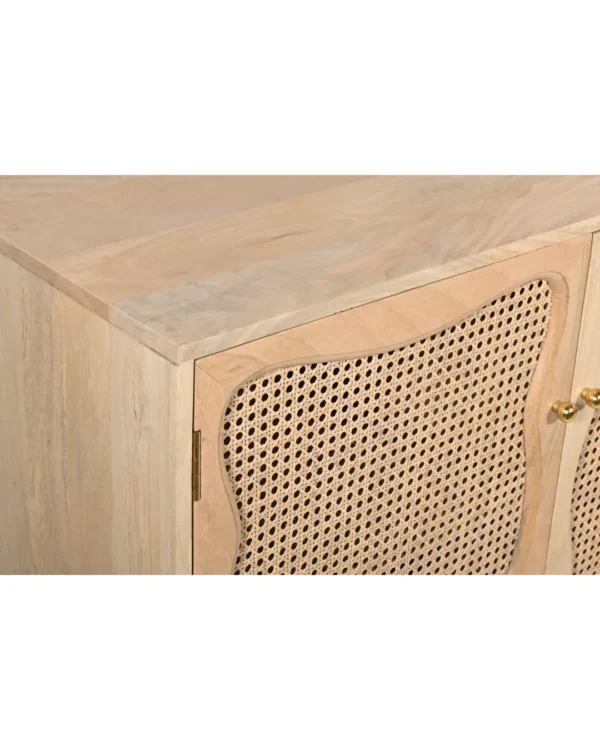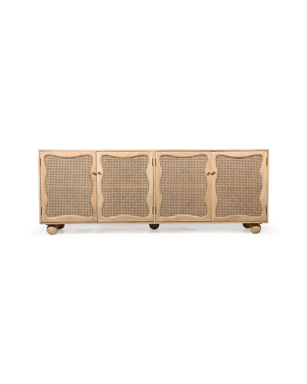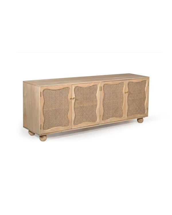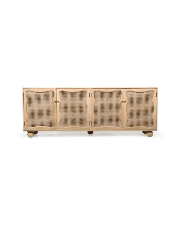 Design Profile: The design profile is a masterclass in Organic Modernism and Coastal Chic, prioritizing natural textures and fluid, playful forms. By contrasting the geometric structure of the sideboard with the soft, undulating lines of the door panels and the voluminous orb feet, the piece achieves a balanced and unique aesthetic. The use of natural cane adds a layer of artisanal craftsmanship and mid-century nostalgia, making it a perfect fit for bright, airy interiors such as Japandi, Tropical Modern, or High-End Coastal. This sideboard serves as a functional art piece that celebrates the serene beauty of blonde timber and woven textures.