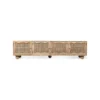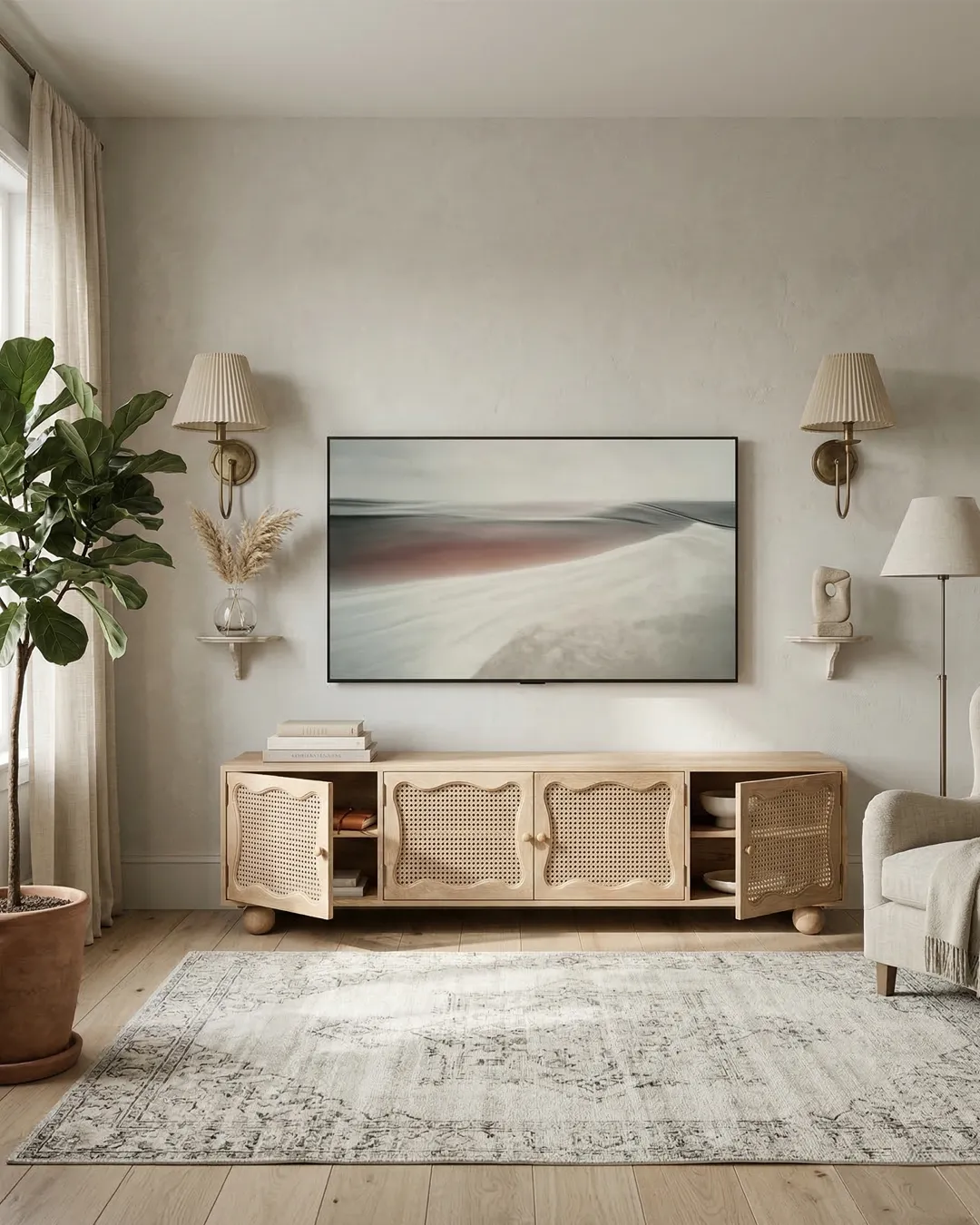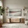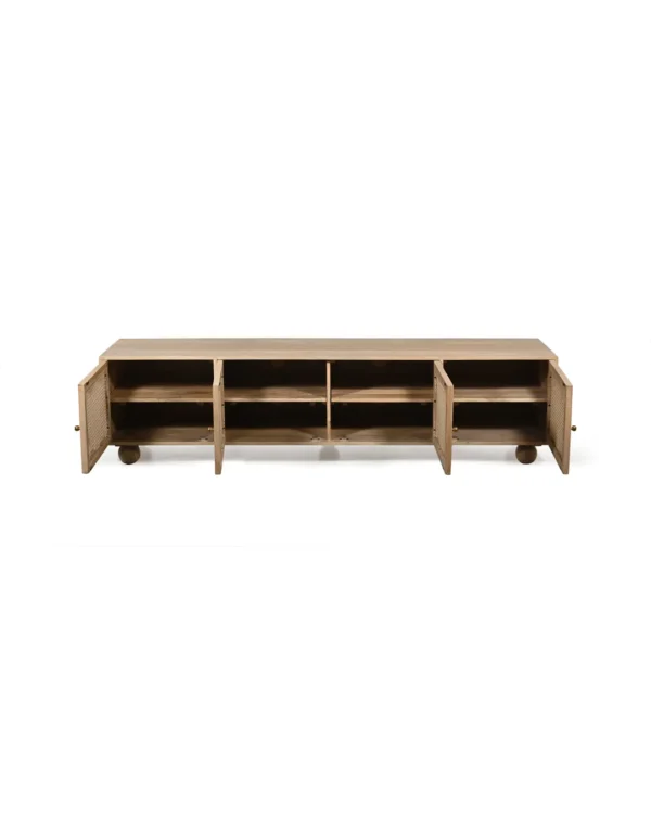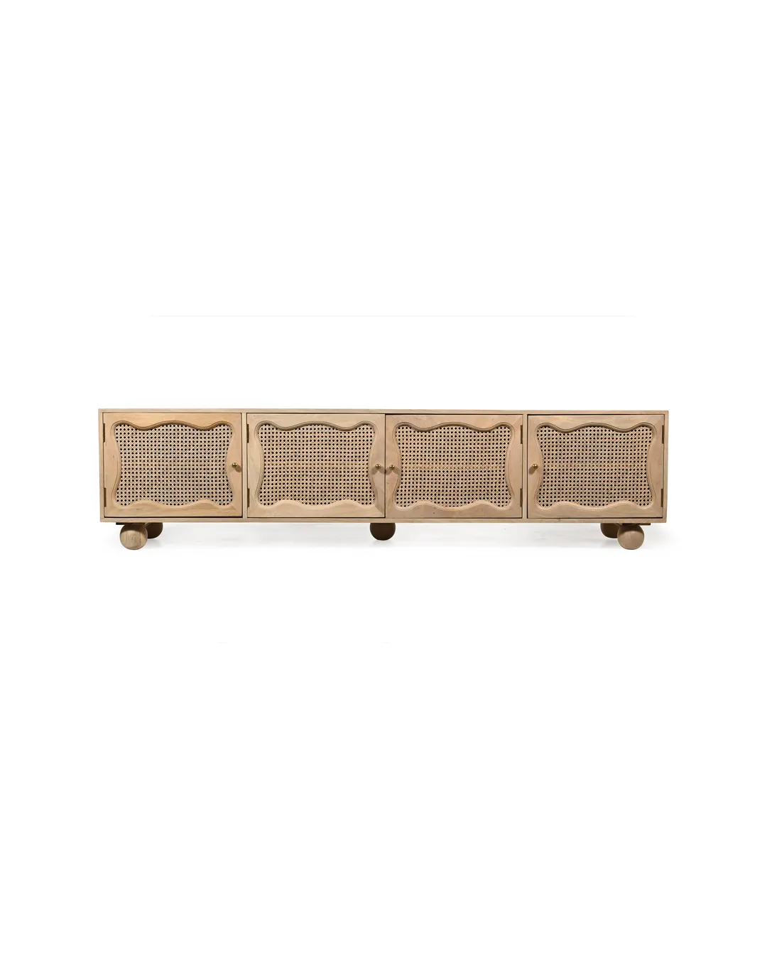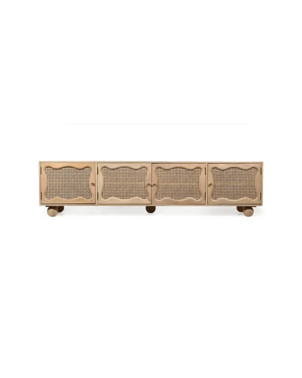 Design Profile: The design profile is a masterclass in Organic Modernism and Coastal Chic, prioritizing natural textures and fluid, playful forms. By contrasting the geometric structure of the media console with the soft, undulating lines of the door panels and the voluminous orb feet, the piece achieves a balanced and unique aesthetic. The use of natural cane adds a layer of artisanal craftsmanship and mid-century nostalgia, making it a perfect fit for bright, airy interiors such as Japandi, Tropical Modern, or High-End Coastal. This TV unit serves as a functional art piece that celebrates the serene beauty of blonde timber and woven textures.