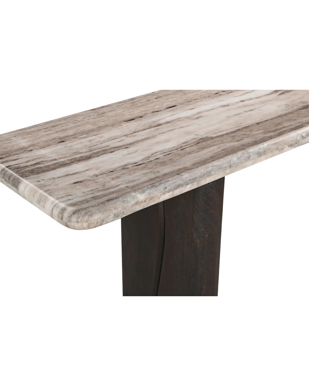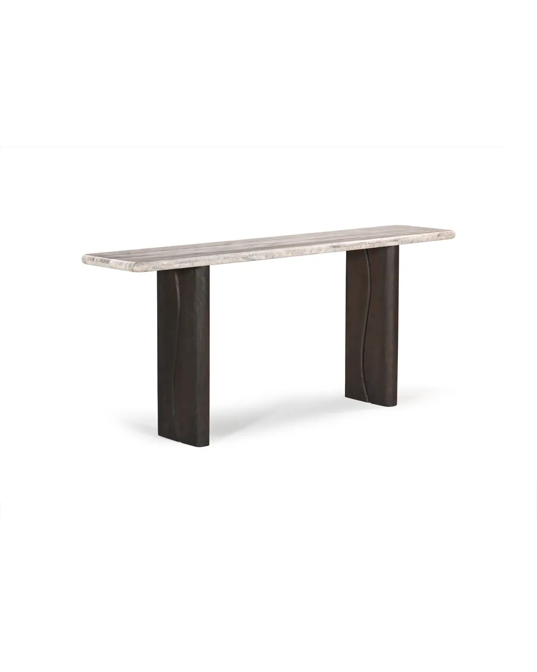 Design Profile: A premium Indian marble known for its creamy white base and flowing grey-to-charcoal veining.ual solid wood pedestals featuring a subtle, vertically carved “S” wave for a contemporary, artistic touch.