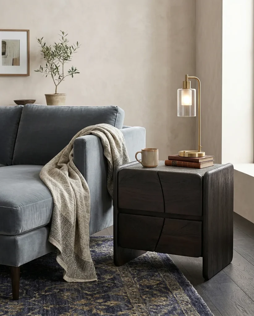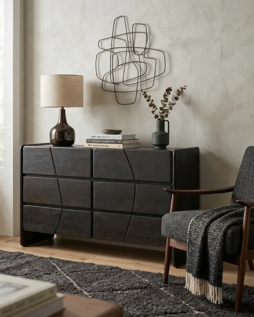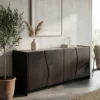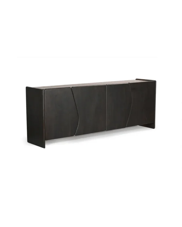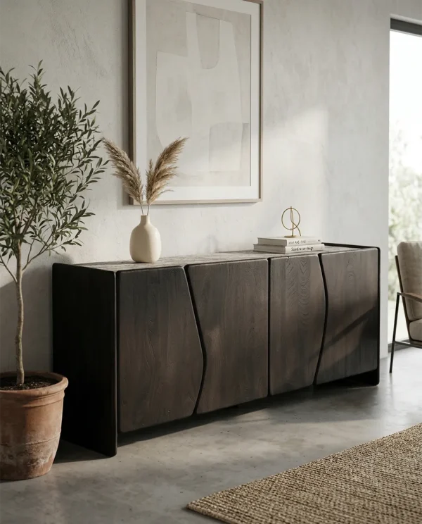 Design Profile: The piece is designed for those who appreciate architectural honesty. Its four cabinet doors feature a unique vertical wave-cut that transforms functional storage into a piece of abstract art.