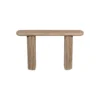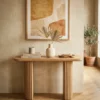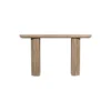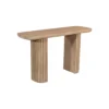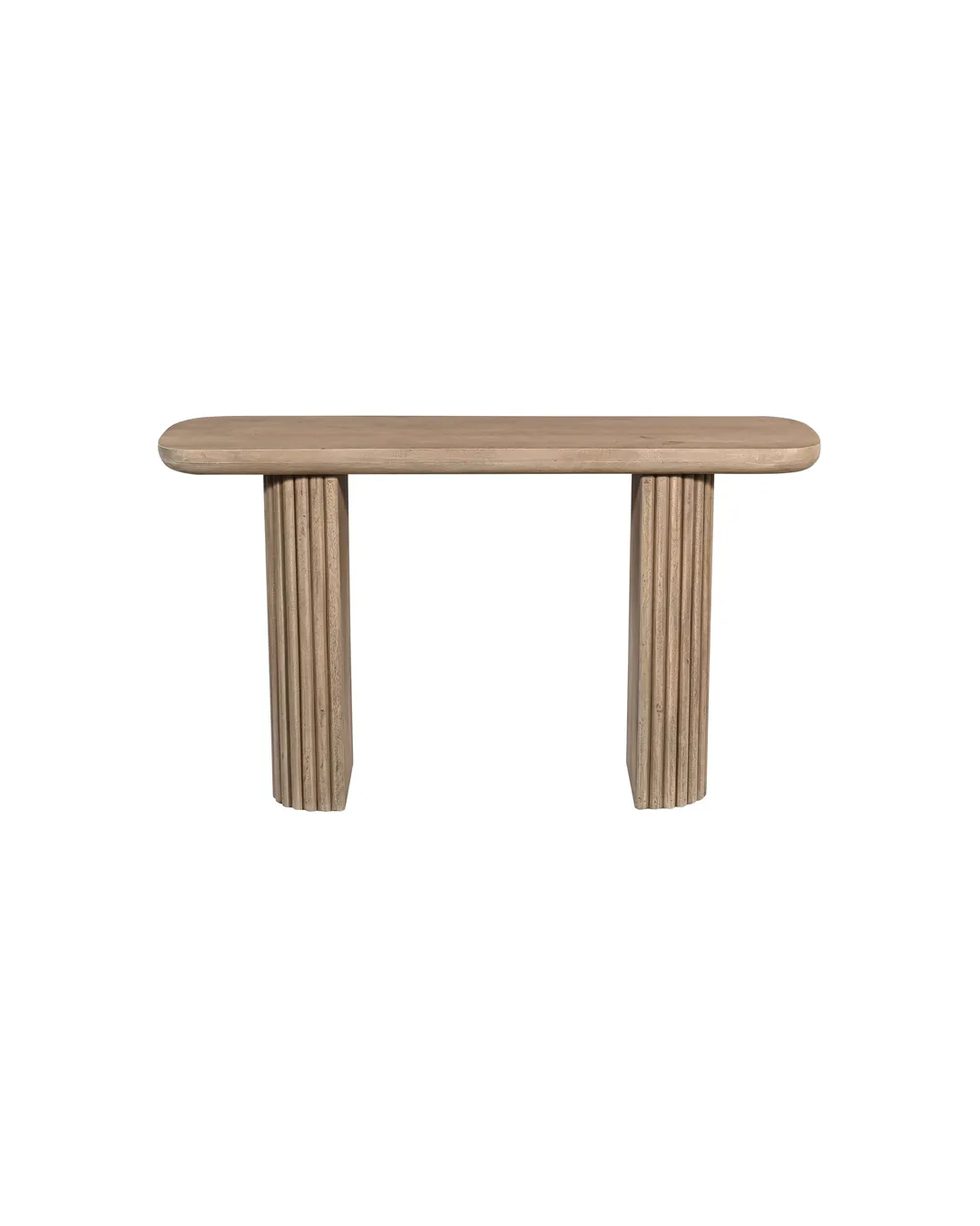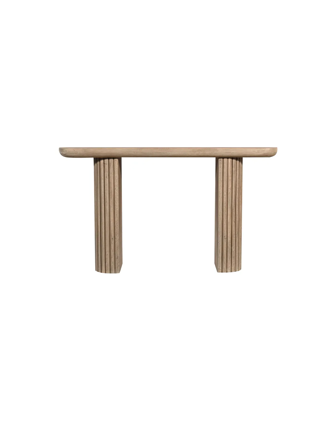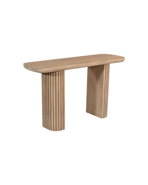 Design Profile:This console table features a slender, pill-shaped top with soft bullnose edges and a warm, natural wood grain. It is supported by two thick, fluted pedestal legs that provide a rhythmic architectural texture and a stable, monolithic presence.