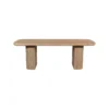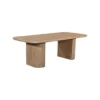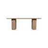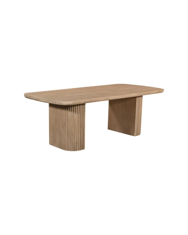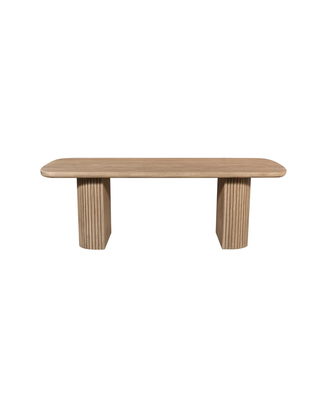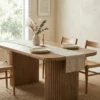 Design Profile: This dining table features a minimalist, pill-shaped top with soft bullnose edges and a warm natural grain. It is supported by two massive, fluted pedestal bases that provide a rhythmic, architectural texture and a grounded, monolithic silhouette.