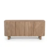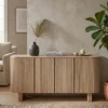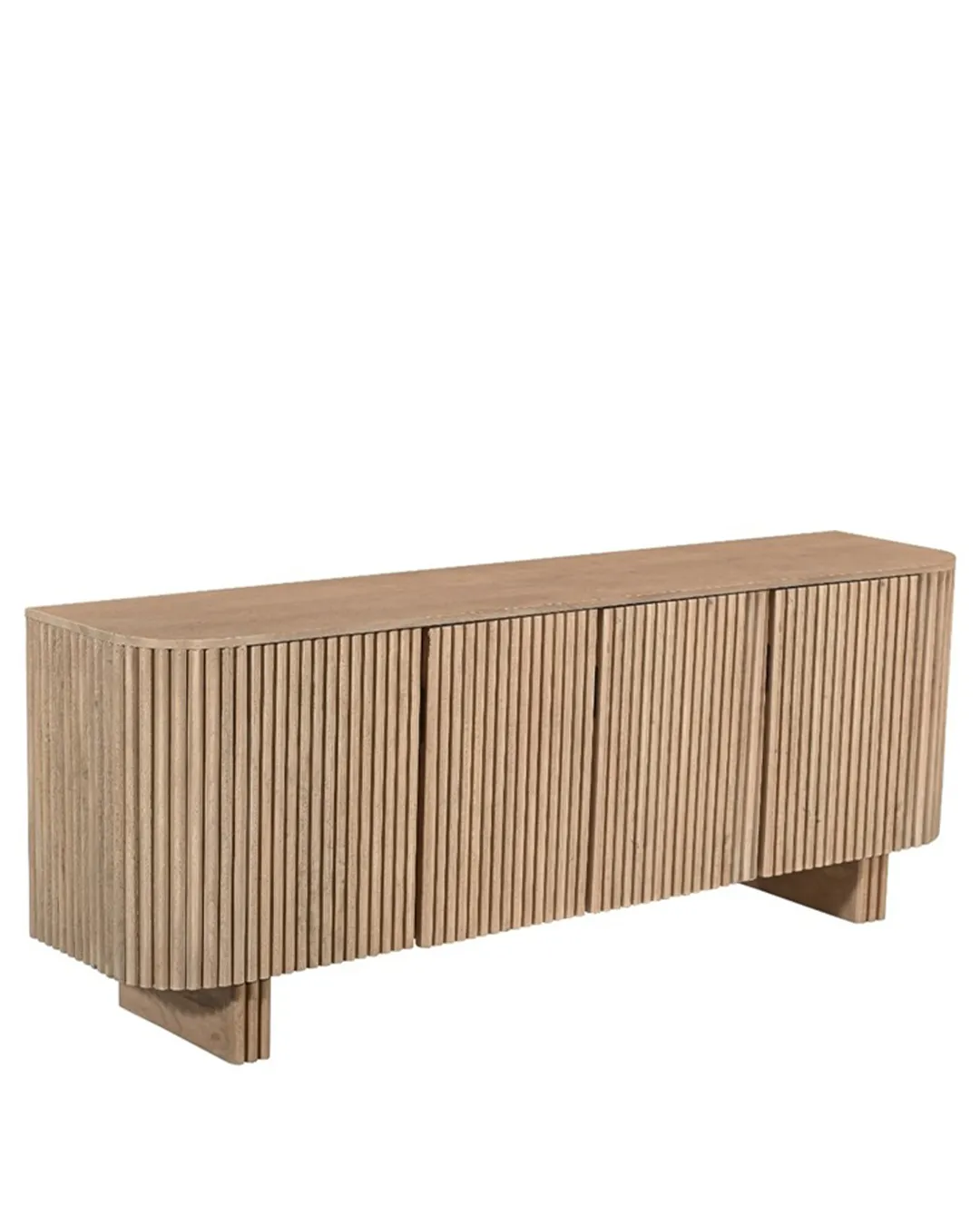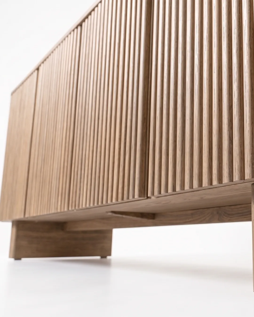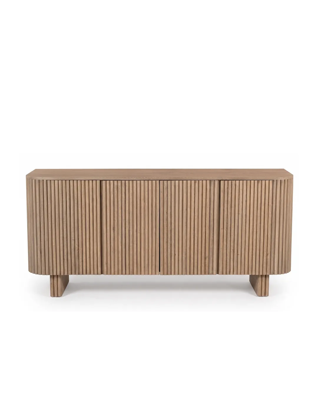 Design Profile:This contemporary sideboard is defined by its soft, pill-shaped silhouette and rhythmic tambour detailing. The curved facade features vertical fluting that seamlessly wraps around the edges, elevated by two architectural slab-style pedestal feet for a light yet grounded presence.