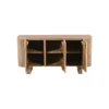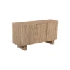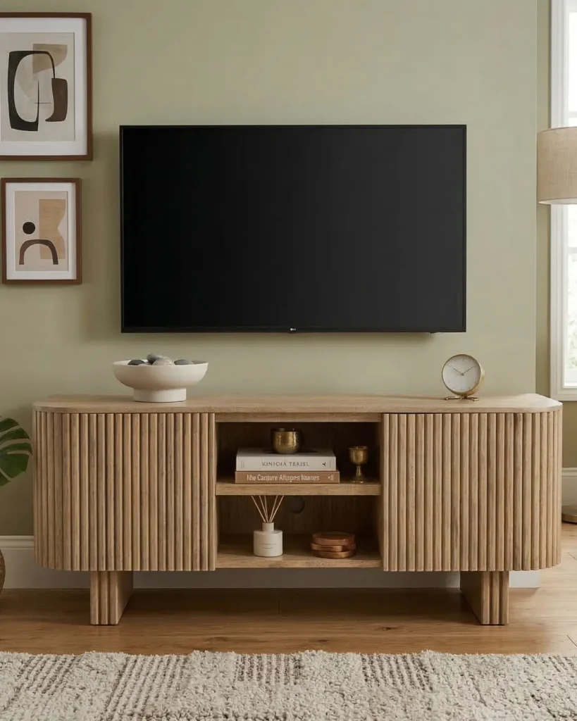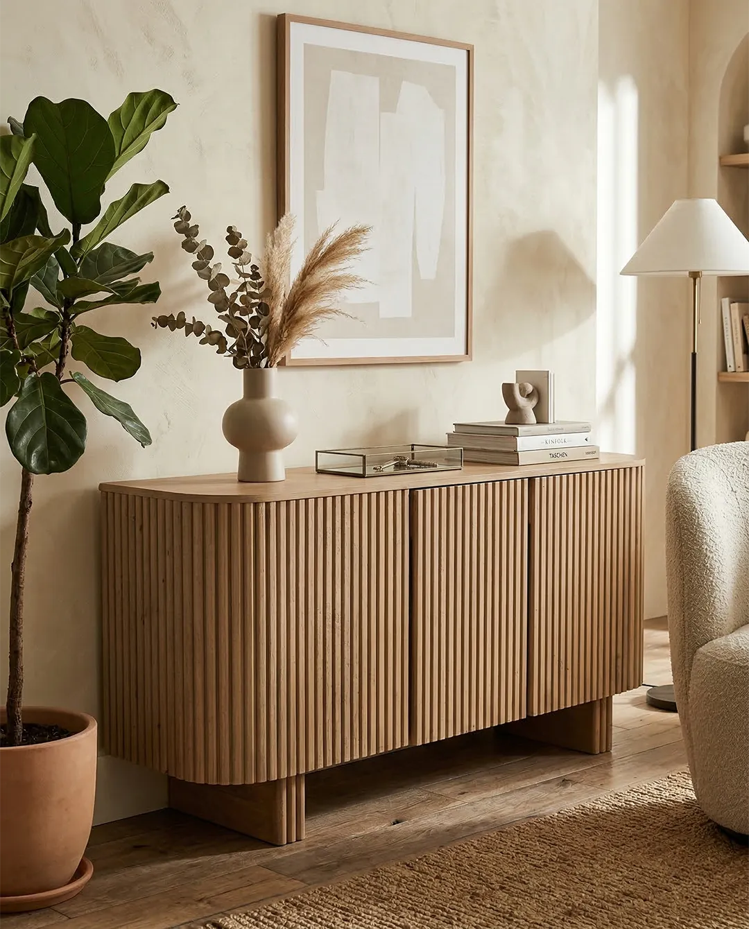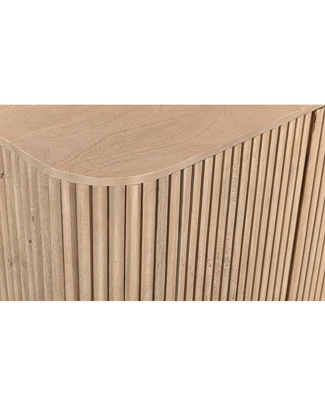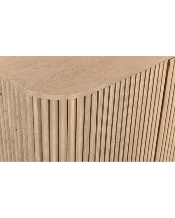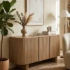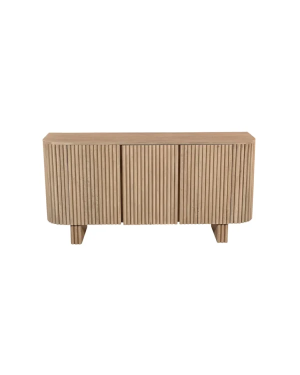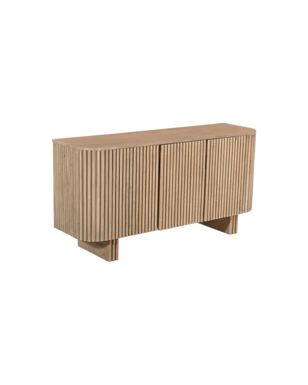 Design Profile:This contemporary sideboard is defined by its soft, pill-shaped silhouette and rhythmic tambour detailing. The curved facade features vertical fluting that seamlessly wraps around the edges, elevated by two architectural slab-style pedestal feet for a light yet grounded presence.