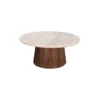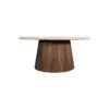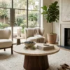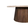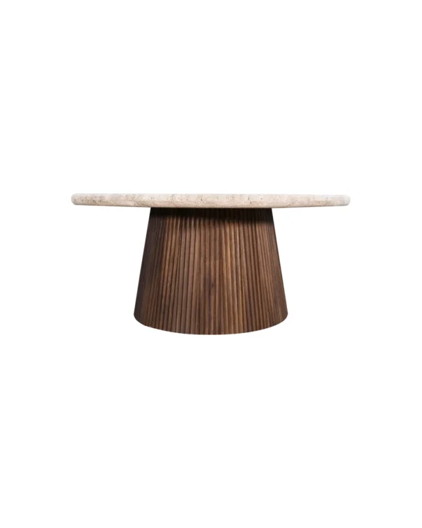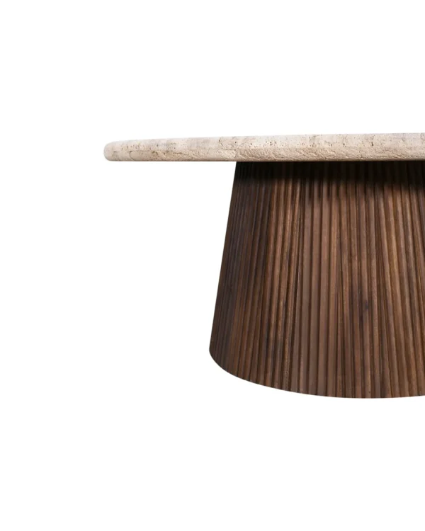 Design Profile: The design profile is rooted in Organic Modernism and Soft Minimalism, prioritizing the juxtaposition of raw and refined textures. By pairing the naturally pitted, matte surface of Italian Travertine with the structured, linear pattern of the fluted timber base, the piece achieves a balanced and high-end aesthetic. The circular geometry of the table provides a fluid, harmonious silhouette that serves as a tactile focal point in contemporary or Japandi-inspired interiors. Durable and visually captivating, this coffee table is a versatile statement of artisanal craftsmanship and the timeless luxury of natural materials.