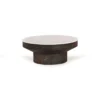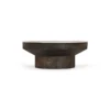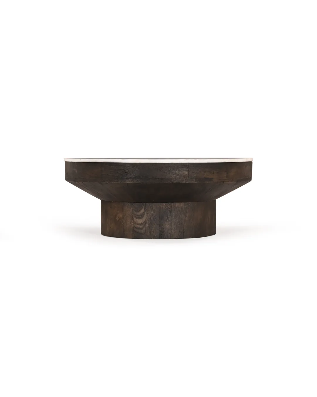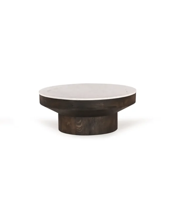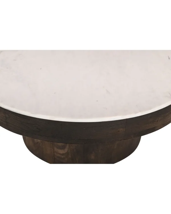 Design Profile: This accent table features a sculptural, goblet-inspired silhouette, pairing a slim circular top of Indian White Marble with a bold, pedestal-style wooden base. The design is defined by a deep, tapered apron that transitions seamlessly into a thick, cylindrical monolithic support, creating a grounded and architectural geometric form.