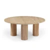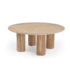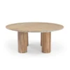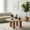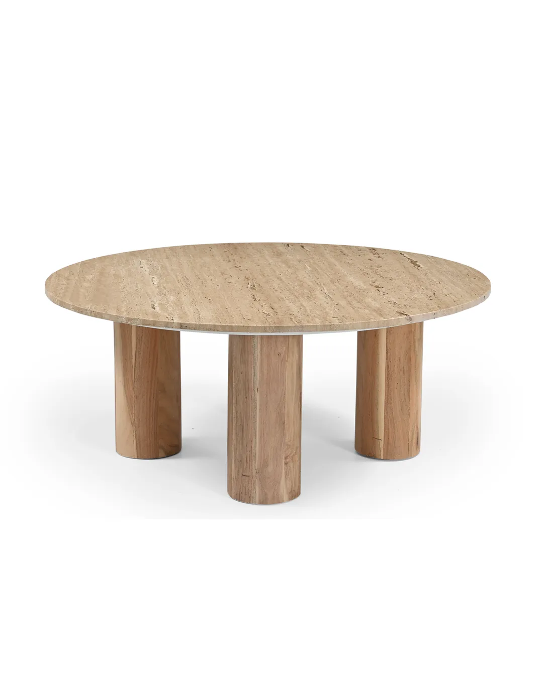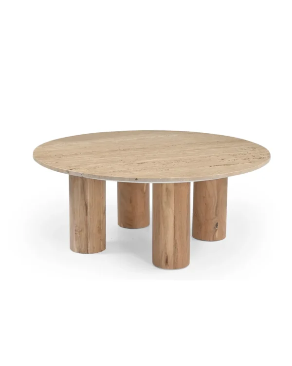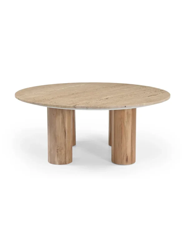 Design Profile: Departing from traditional four-leg designs, this table is supported by a clustered “forest” of five thick, cylindrical travertine pillars. This multi-leg configuration creates a sense of rhythmic architectural strength, reminiscent of classical ruins reimagined for a contemporary lounge. Every surface is left with a matte, honed finish to emphasize the natural stone’s porosity and “Quiet Luxury” appeal.