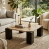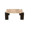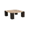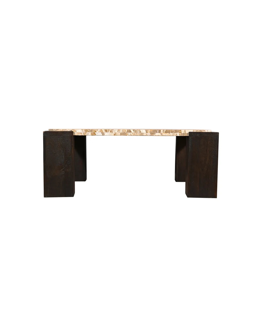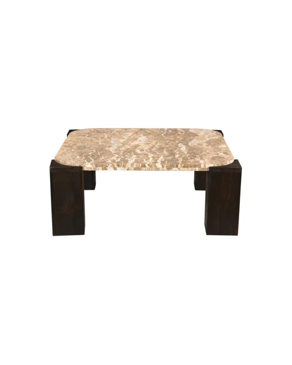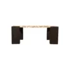 Design Profile: This table is defined by its four monolithic, square-column legs. Finished in a deep, charred charcoal wood, these pillars are notched to “cradle” the marble slab, creating a seamless, integrated appearance. The dark, architectural base provides a heavy, grounded foundation that makes the rich textures of the Panther Marble truly vibrate within a room.