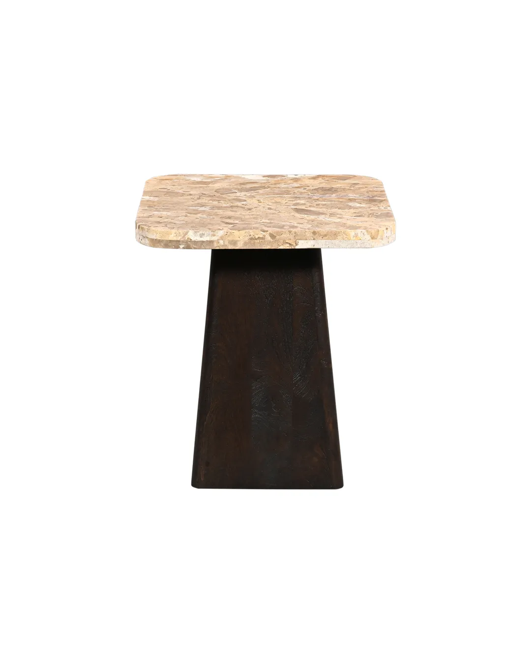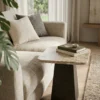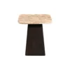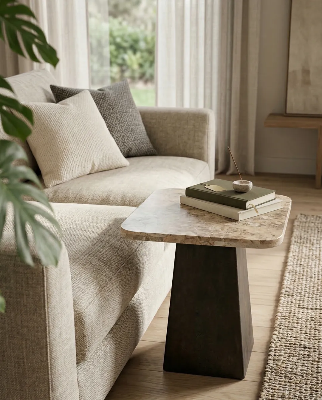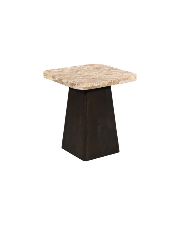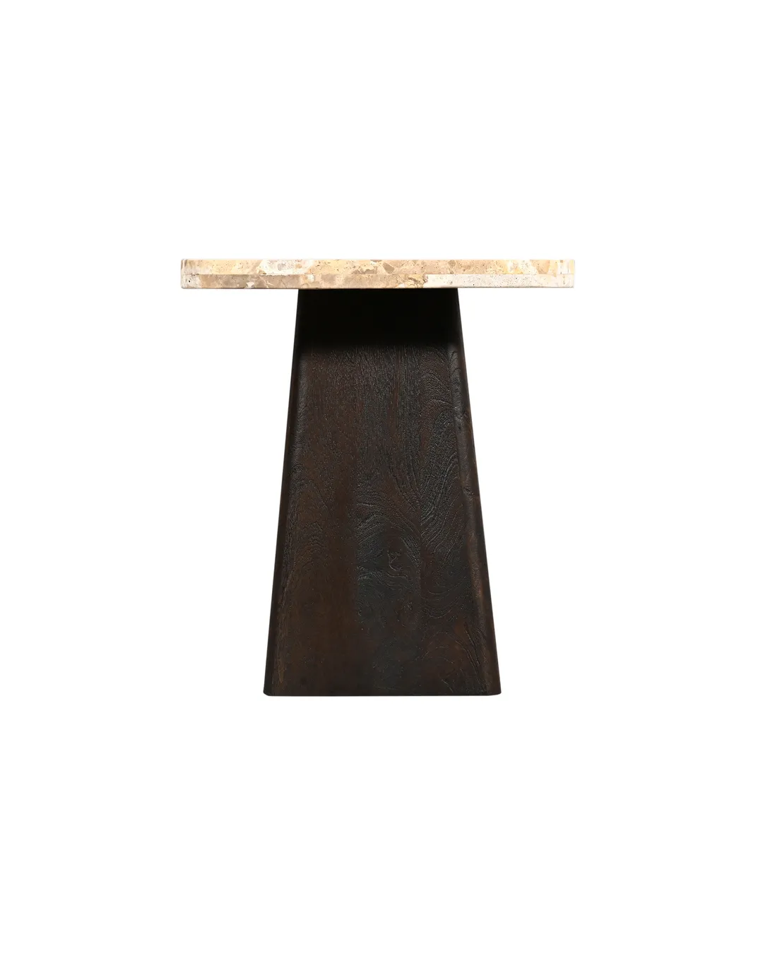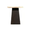 Design Profile: The table is supported by a single, monolithic pedestal base crafted from solid wood. The base is designed as a tapered obelisk, finished in a deep, charred charcoal that emphasizes its silhouette. This grounded, “bottom-heavy” design ensures stability while creating a powerful visual statement, making it an ideal companion for a low-profile sofa or as a sculptural accent in a minimalist interior.
