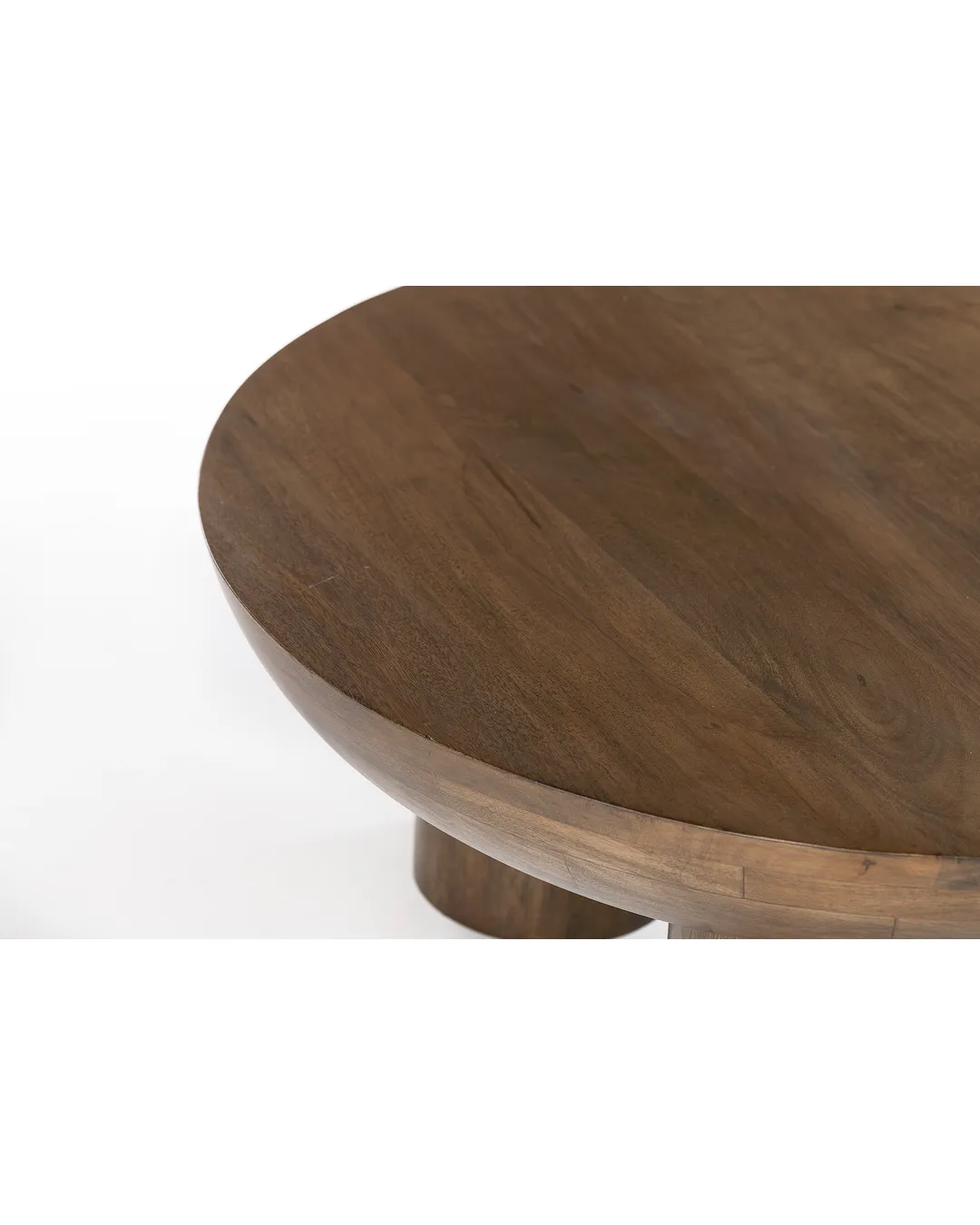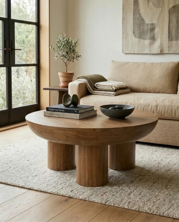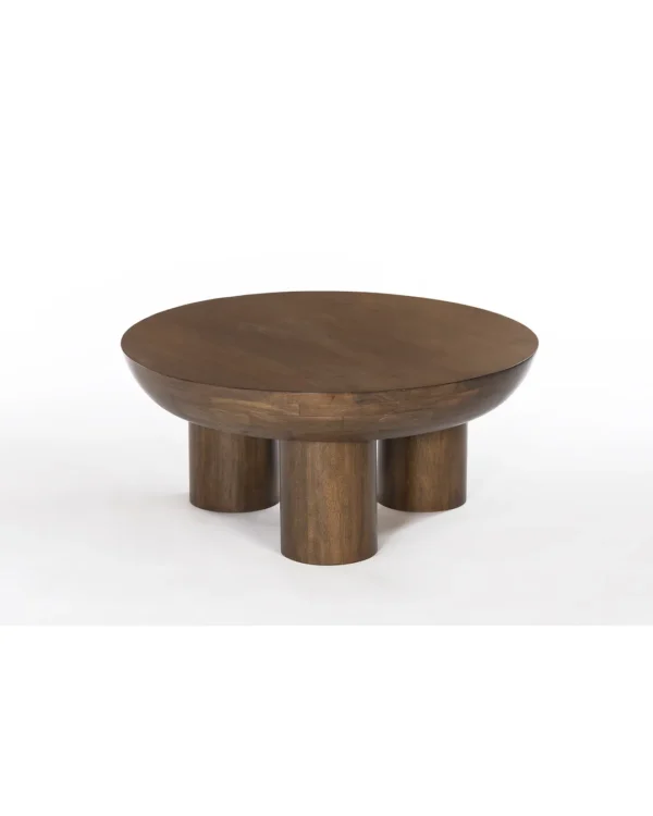 Design Profile: This coffee table features a bold, primitive-modern silhouette defined by a thick, bowl-shaped circular top with deep, rounded “bullnose” edges. It is supported by three substantial, cylindrical monolithic legs that provide a grounded, architectural rhythm and a sturdy, hand-carved presence.