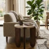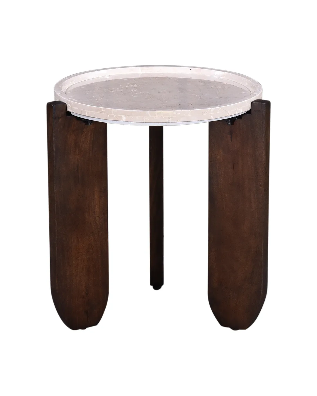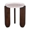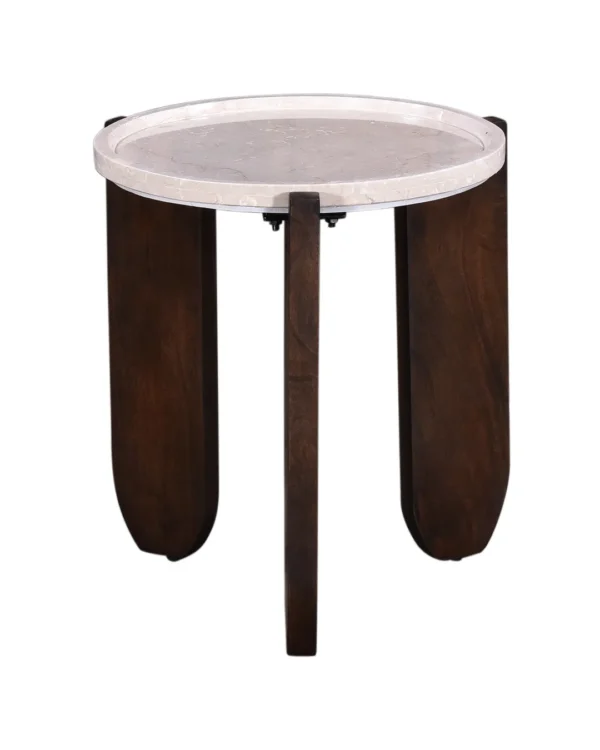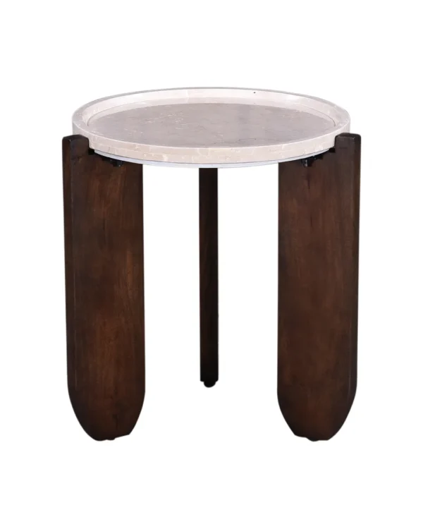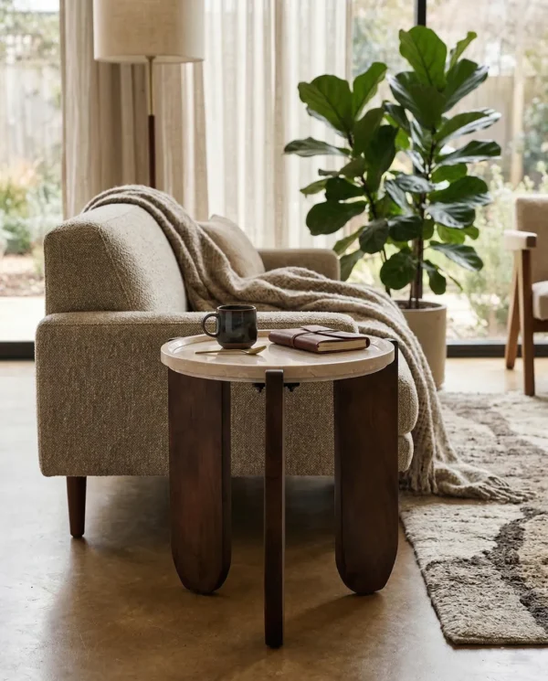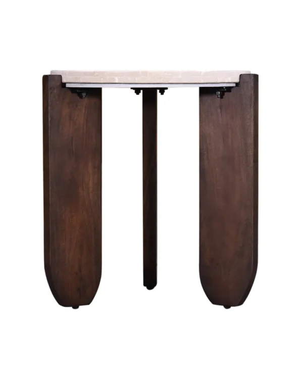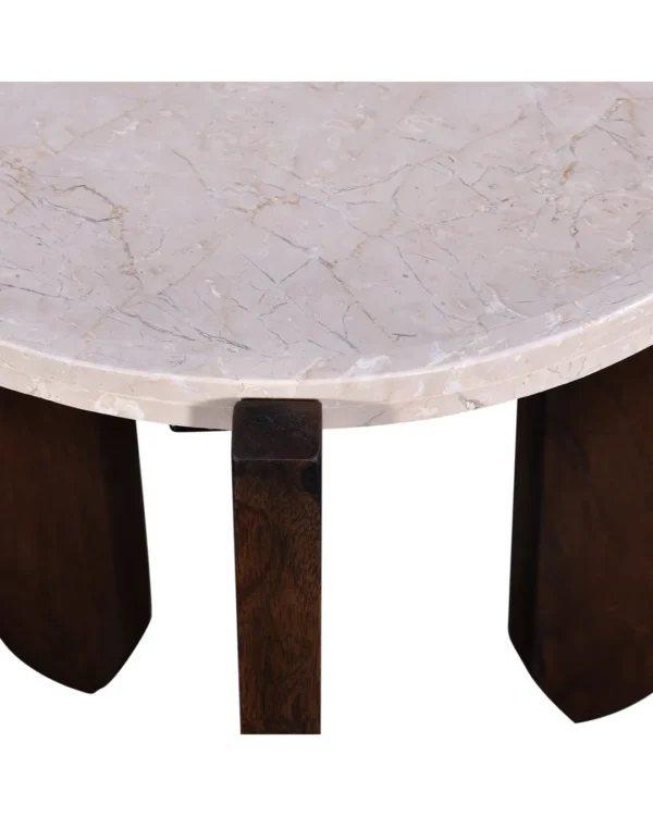 Design Profile: The design profile aligns with Modern Brutalism and Organic Minimalism, prioritizing the interplay of raw textures and exaggerated geometric forms. By utilizing a recessed stone surface cradled by a heavy, hand-finished timber base, the piece achieves a unique visual balance that is both sturdy and refined. The choice of premium Botticino marble and artisanal mango wood ensures a high-end, tactile experience, while the architectural tripod configuration makes it an ideal anchor for contemporary lounge seating or “Quiet Luxury” interiors.